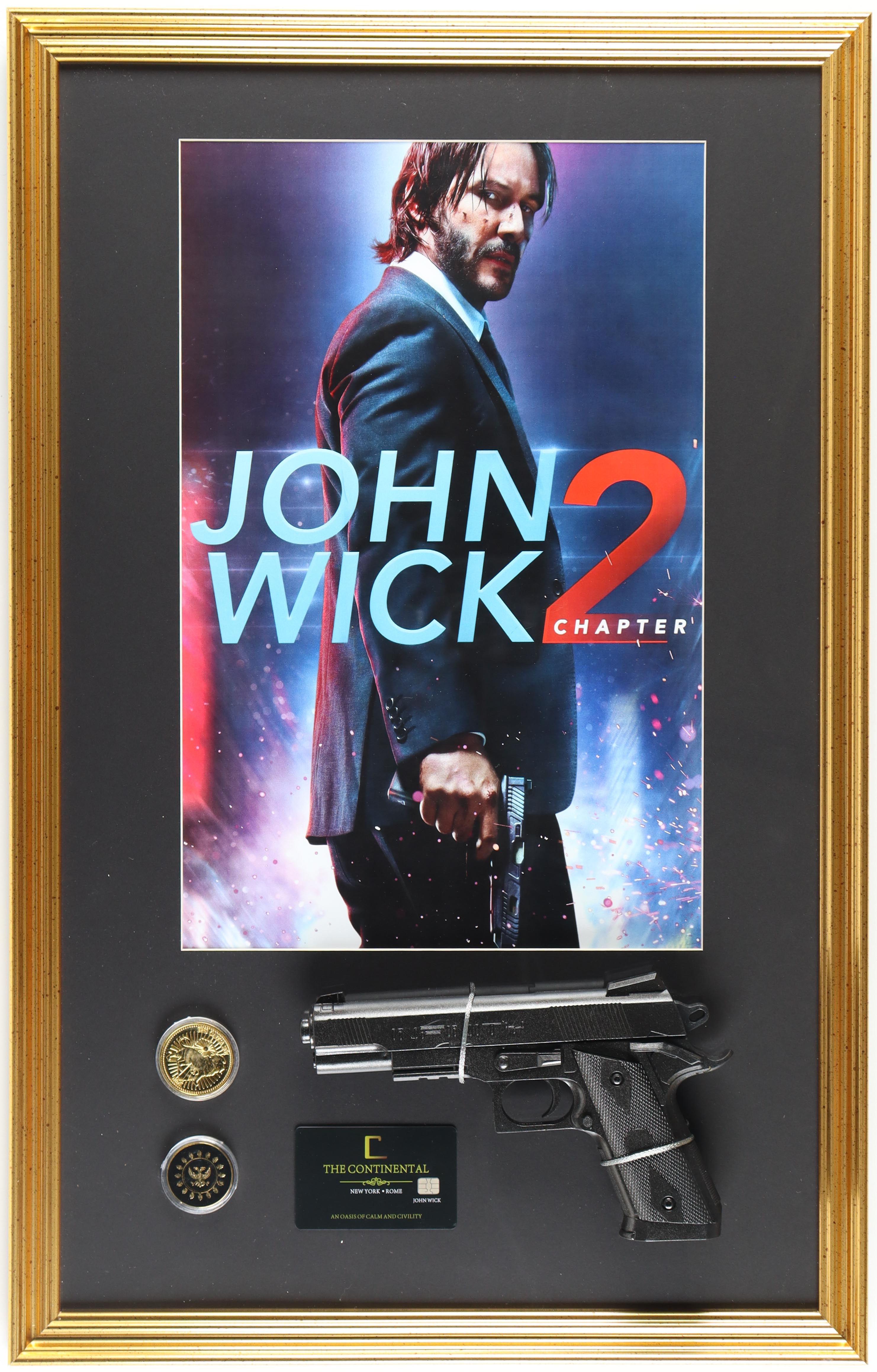 "John Wick Chapter 2" Custom Framed Movie Poster Display with Replica Prop Pistol, Adjudicator Black Coin, Gold Coin & Continental Key Card