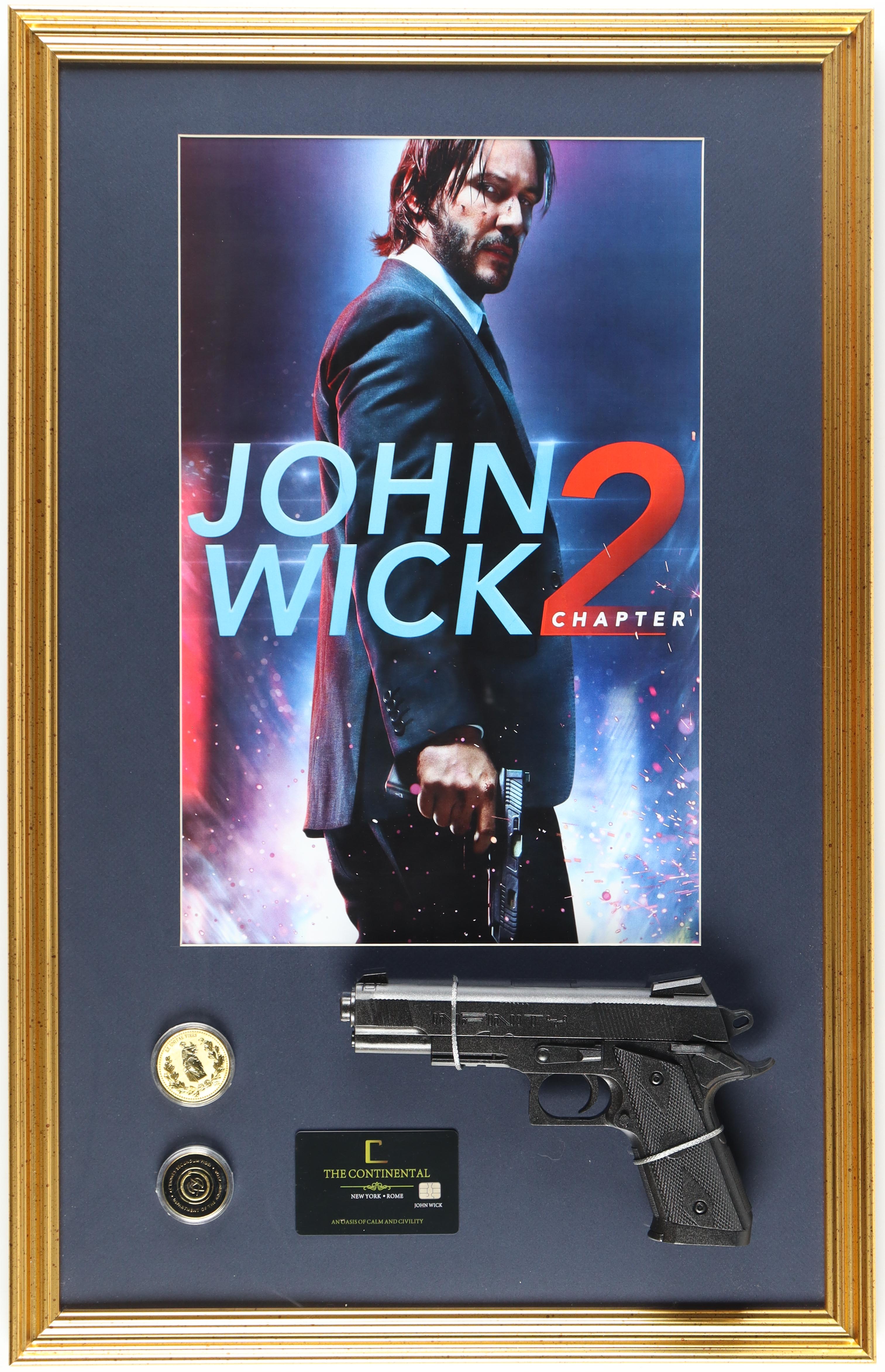 "John Wick Chapter 2" Custom Framed Movie Poster Display with Replica Prop Pistol, Adjudicator Black Coin, Gold Coin & Continental Key Card
