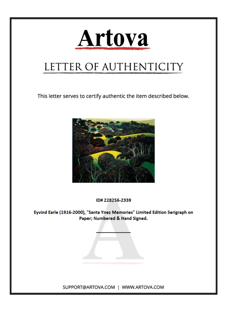 "Santa Ynez Memories" is a limited edition serigraph on paper by Eyvind Earle (1916-2000). The piece is numbered, hand-signed by the artist, and accompanied by a certificate of authenticity. Measures approximately 22" x 28" (image).