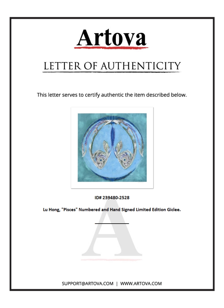 The zodiac is a phenomenological study, formed by coordination between 12 specific constellations in space and birth of one specific human being in time, contrasting 12 signs that guide the meditation of love, fate and purpose of one's life. "Pisces (2/20 - 3/20)" is a limited edition giclee on paper by talented Chinese artist Lu Hong, numbered and hand signed by the artist! Measures approx. 24" x 24" (with border), 20" x 20" (image).