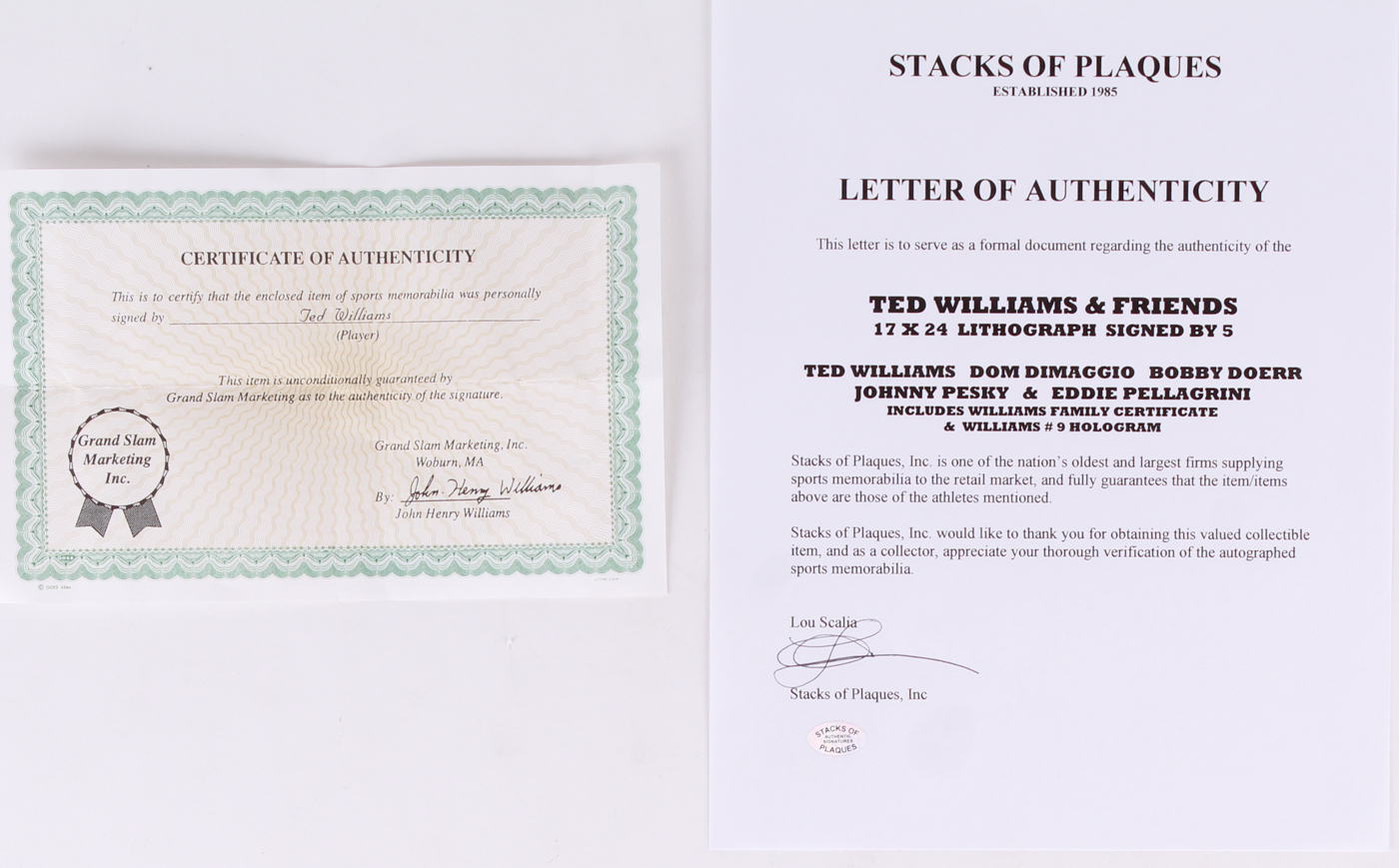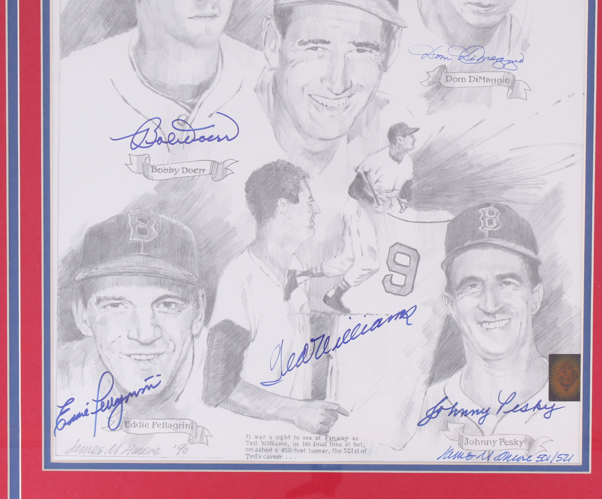 Framed Lithograph measures 22" x 29" in size. Hand-signed in blue felt-tip pen by (5) former Boston Red Sox players including Ted Williams (HOF, D 2002), Bobby Doerr (HOF), Dom DiMaggio (D 2009), Eddie Pellegrini (D 2006) and Johnny Pesky (D 2012). The lithograph is also signed in pencil and blue felt-tip pen by the artist James M. Amore, dated 1990. Limited edition and hand written #501/521.