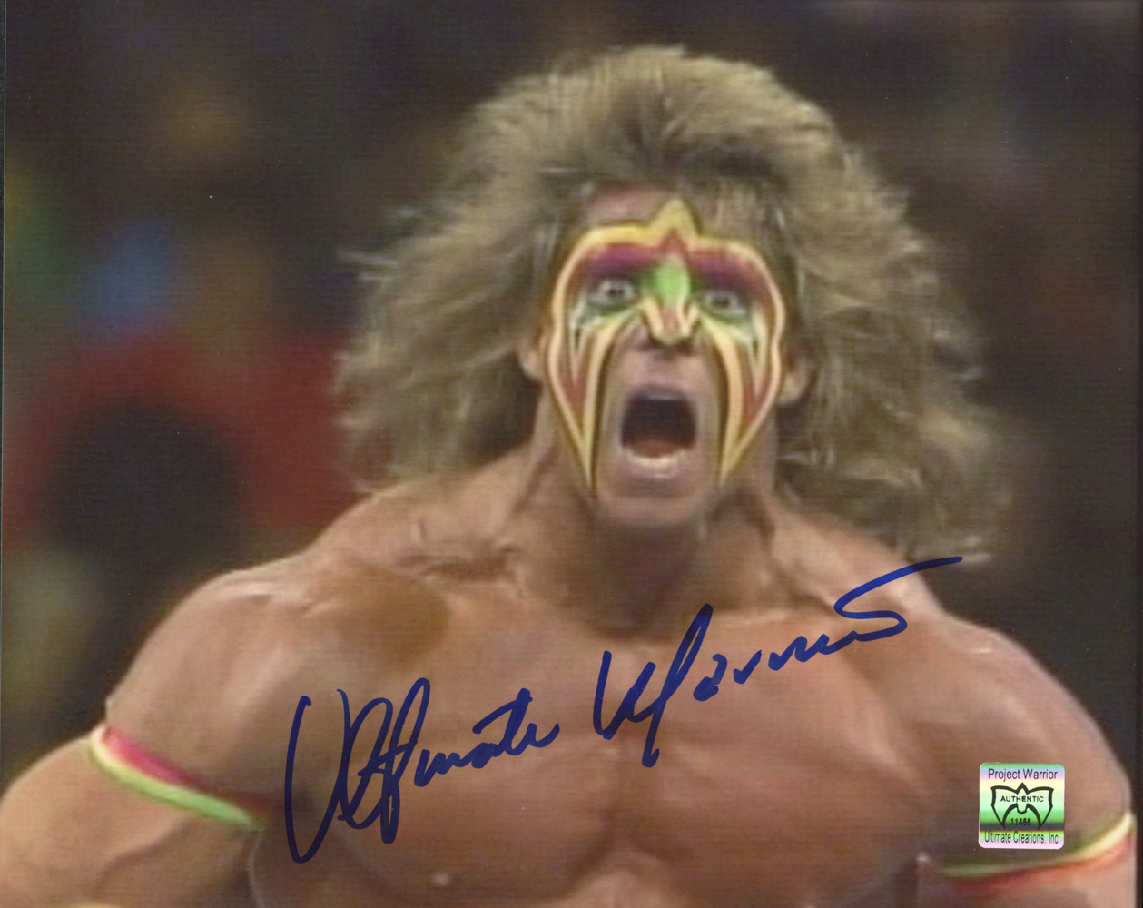 Photo measures 8" x 10" in size. Hand-signed in blue felt-tip pen by The Ultimate Warrior (D 2014, James Brian Hellwig).