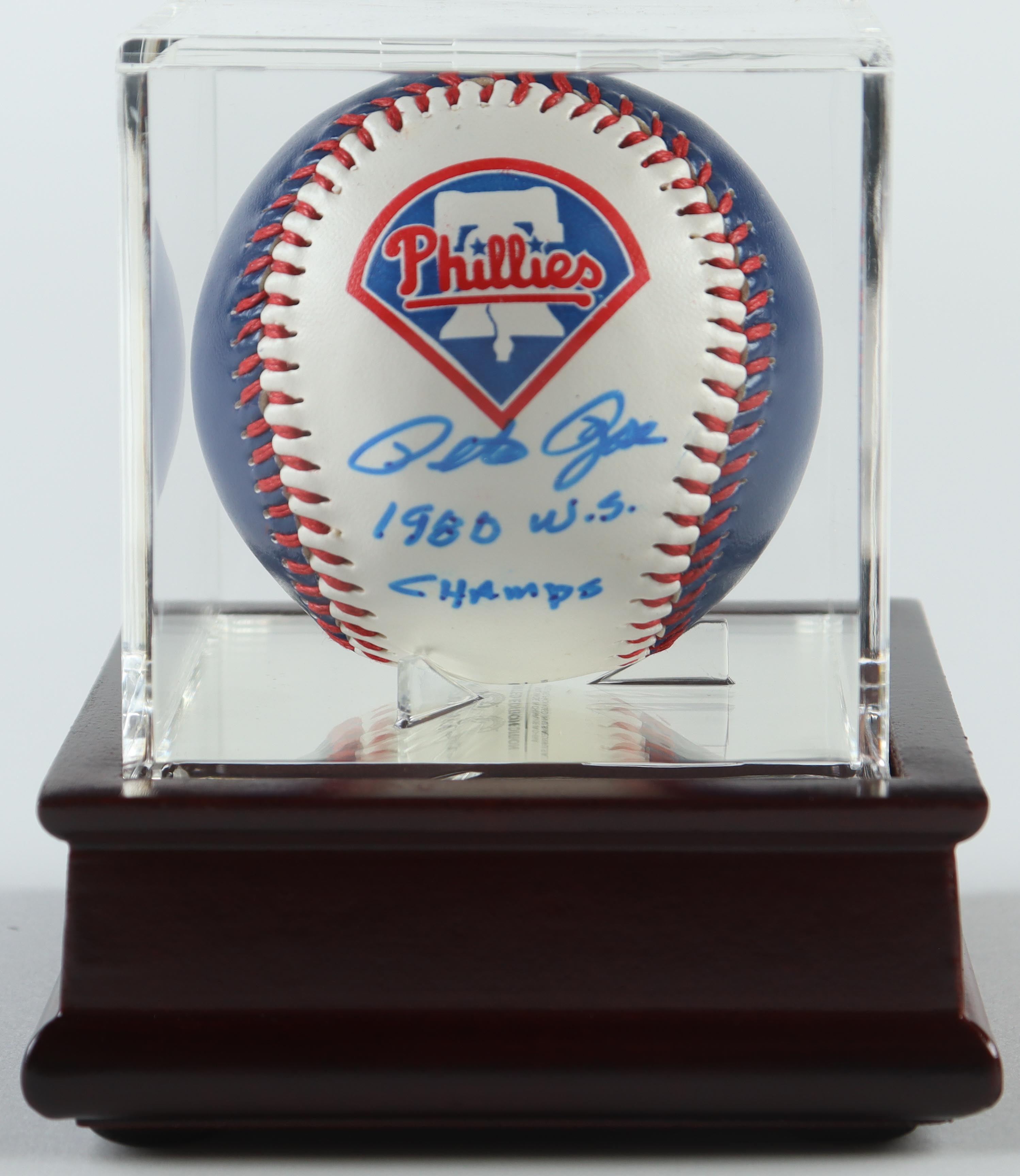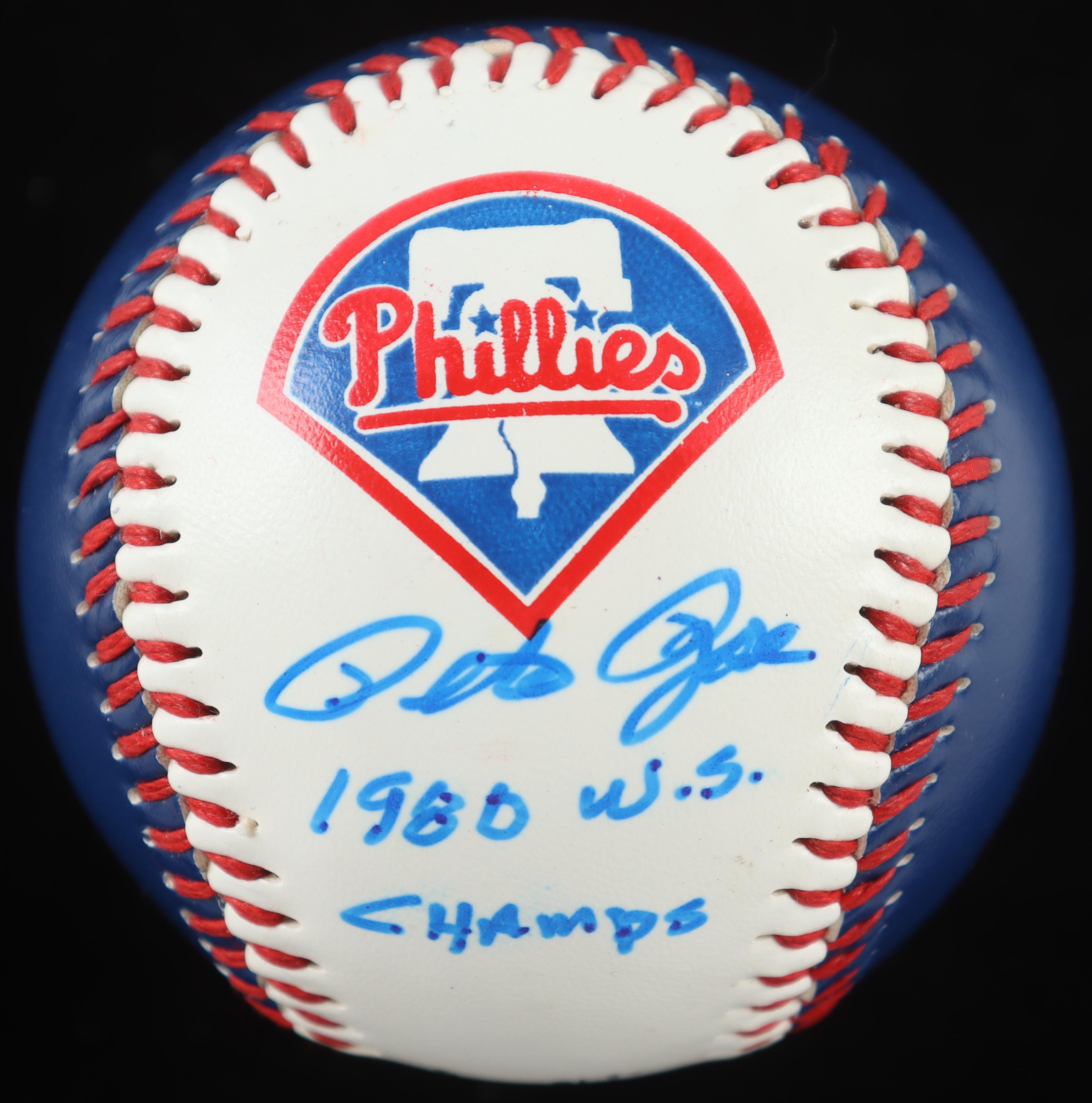 Pete Rose Signed Phillies Logo Baseball Inscribed "1980 W.S. Champs" with Display Case (JSA)