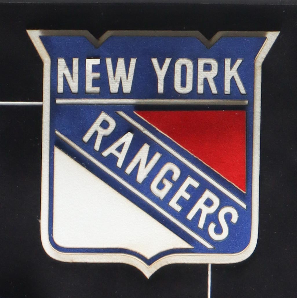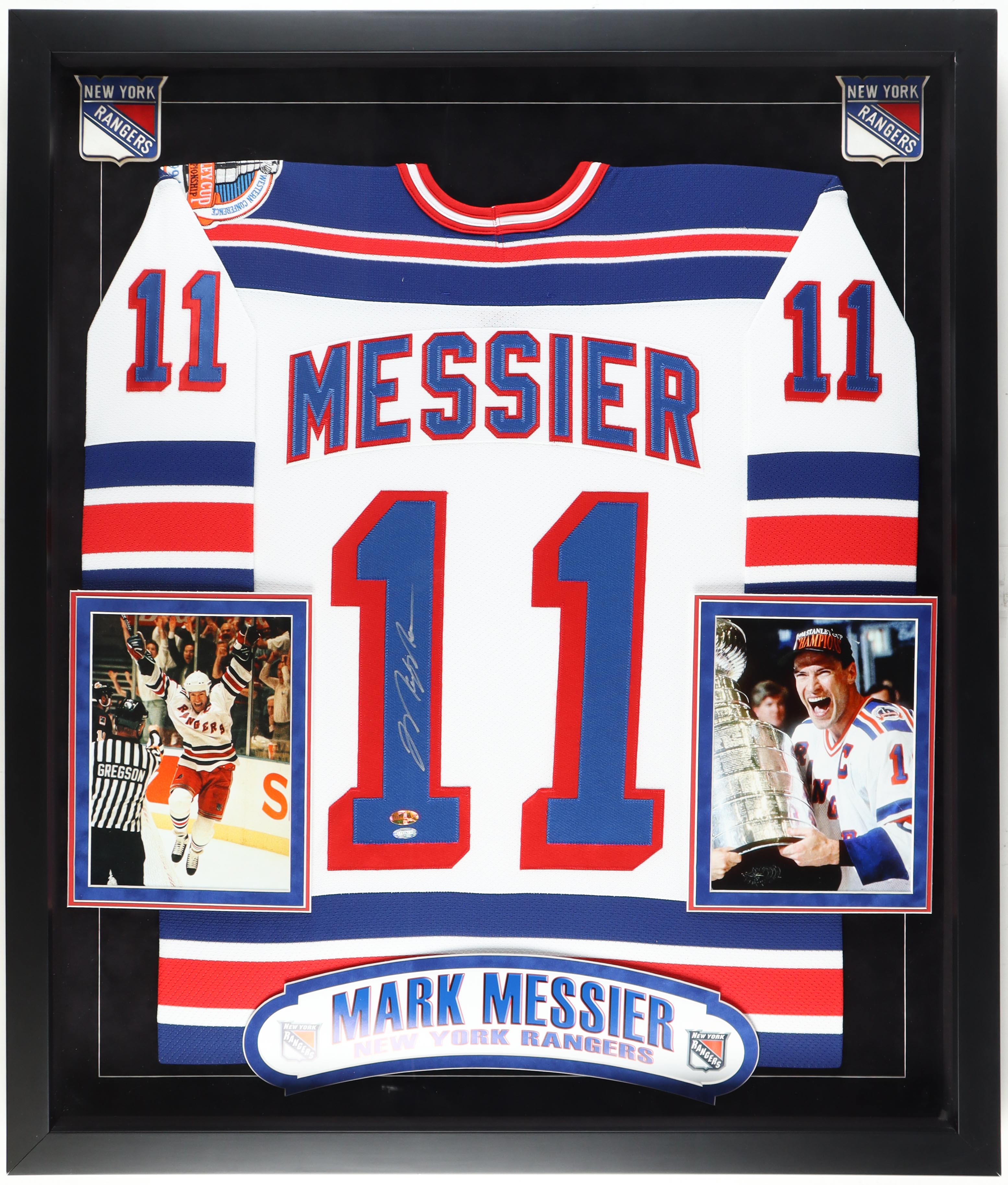 Custom framed display measures 34" x 40" in size and features a jersey with everything sewn on. Jersey has been hand-signed by Mark Messier (New York Rangers, HOF).
