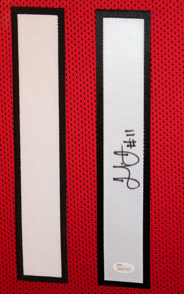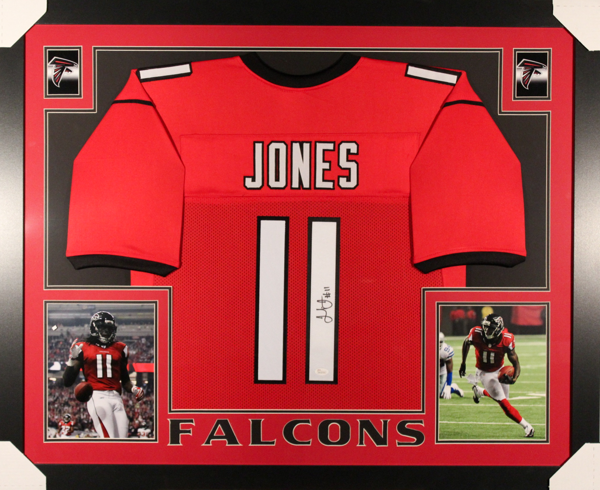 Custom frame measures approximately 35" x 43" in size and features a jersey which has been hand-signed in black felt-tip pen by Julio Jones.