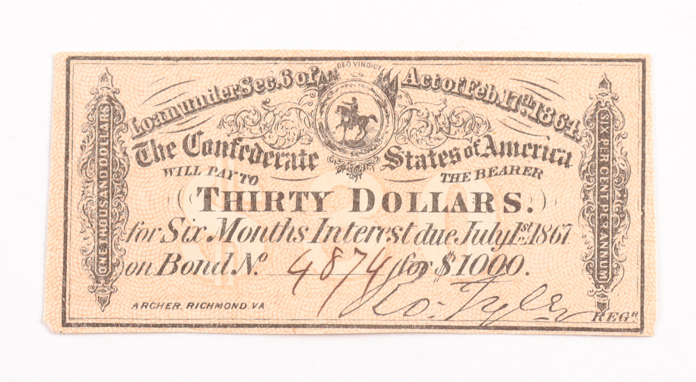 1864 $30 Thirty Dollars Confederate States of America Richmond CSA Bank Note Bond