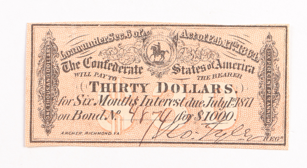 1864 $30 Thirty Dollars Confederate States of America Richmond CSA Bank Note Bond