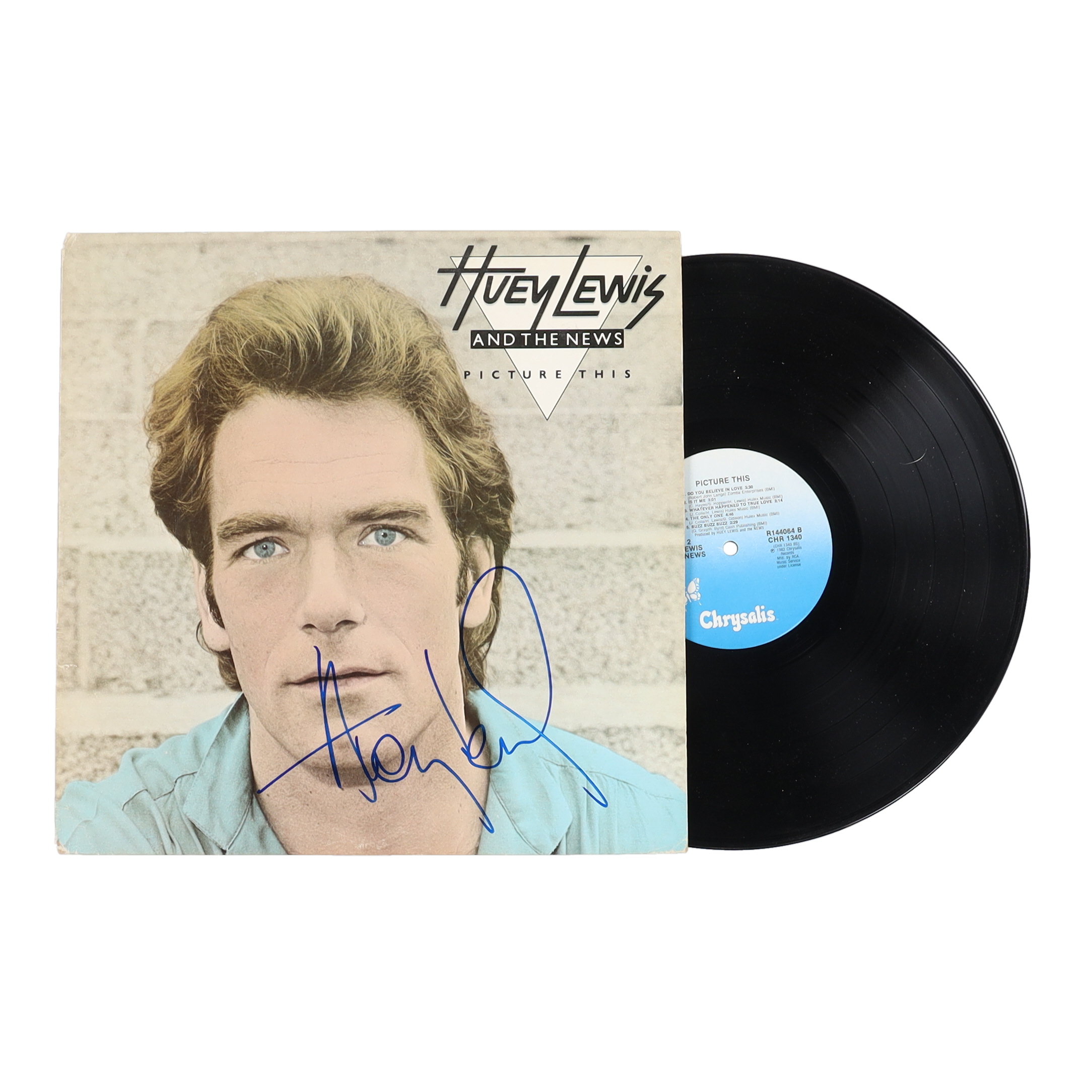 Vinyl record album has been hand-signed on the front cover by Huey Lewis.
