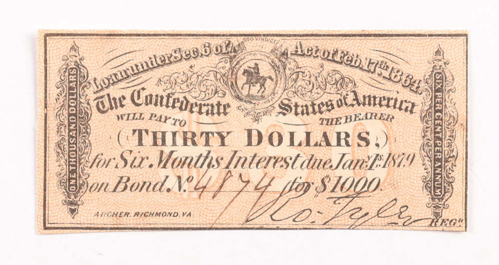 1864 $30 Thirty Dollars Confederate States of America Richmond CSA Bank Note Bond
