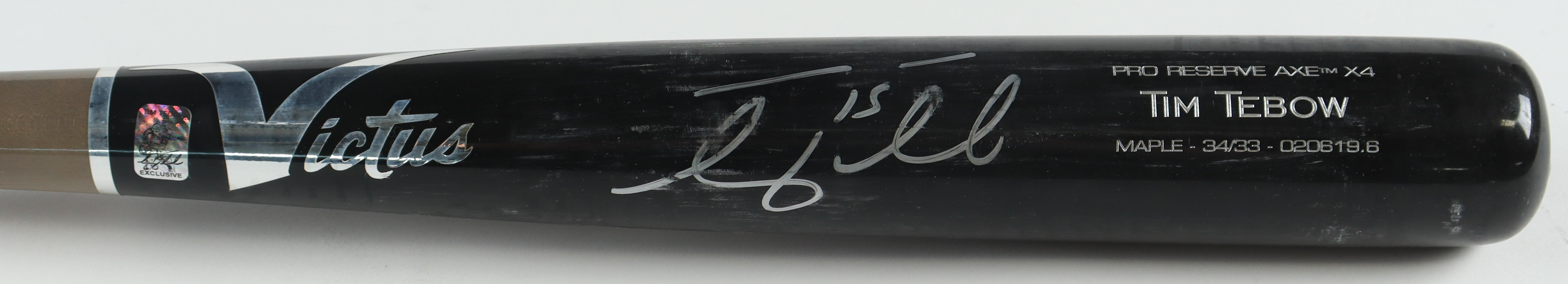 Victus Tim Tebow Axe X4 Pro Reserve Model baseball bat. Hand-signed by Tim Tebow (New York Mets). Please note the bat is worn down from use and the signature is scuffed.