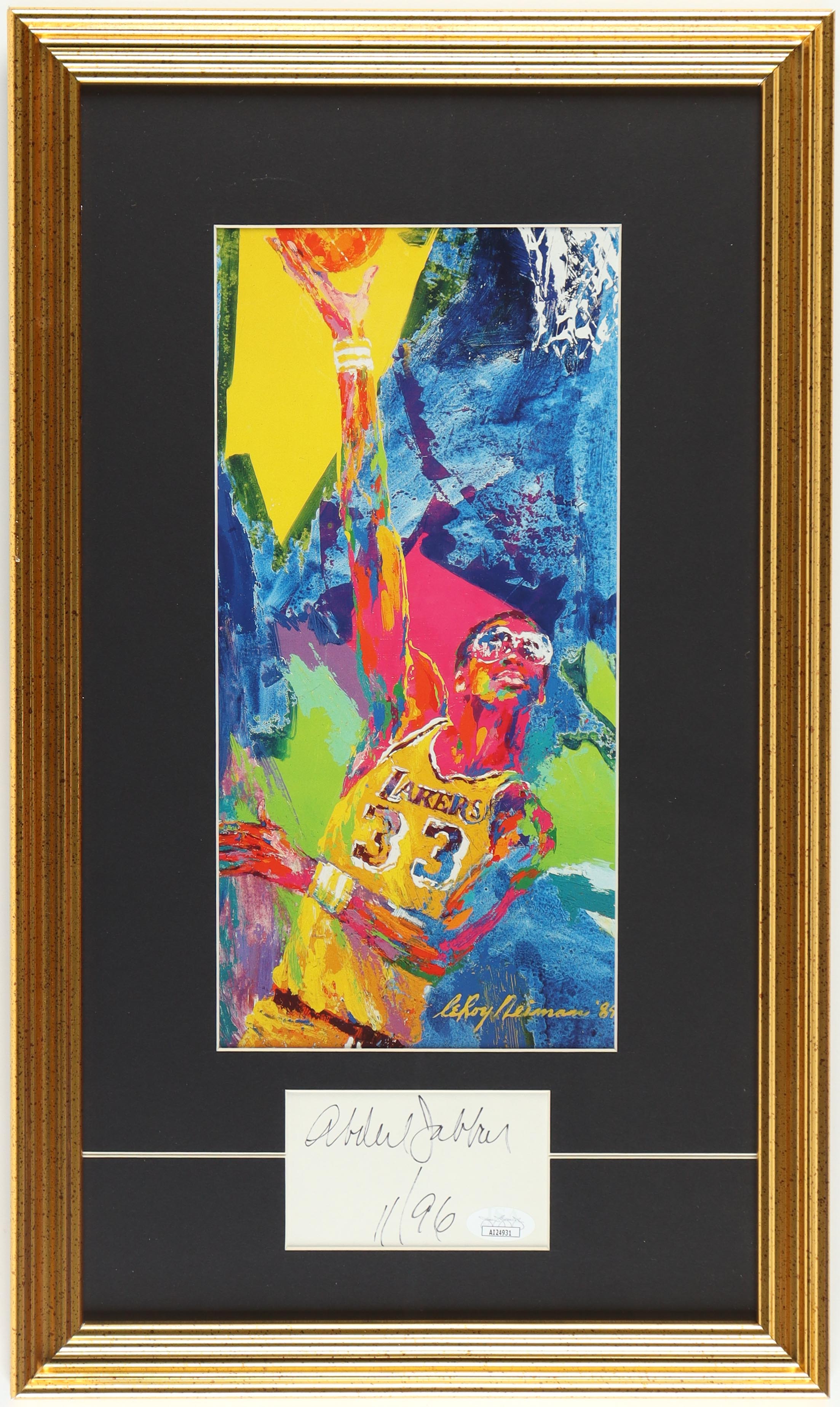 Custom frame measures 12" x 20" in size and features a cut that has been hand-signed and inscribed by Kareem Abdul-Jabbar (Los Angeles Lakers, HOF). Display also includes a print of LeRoy Neiman's "Kareem Abdul-Jabbar".