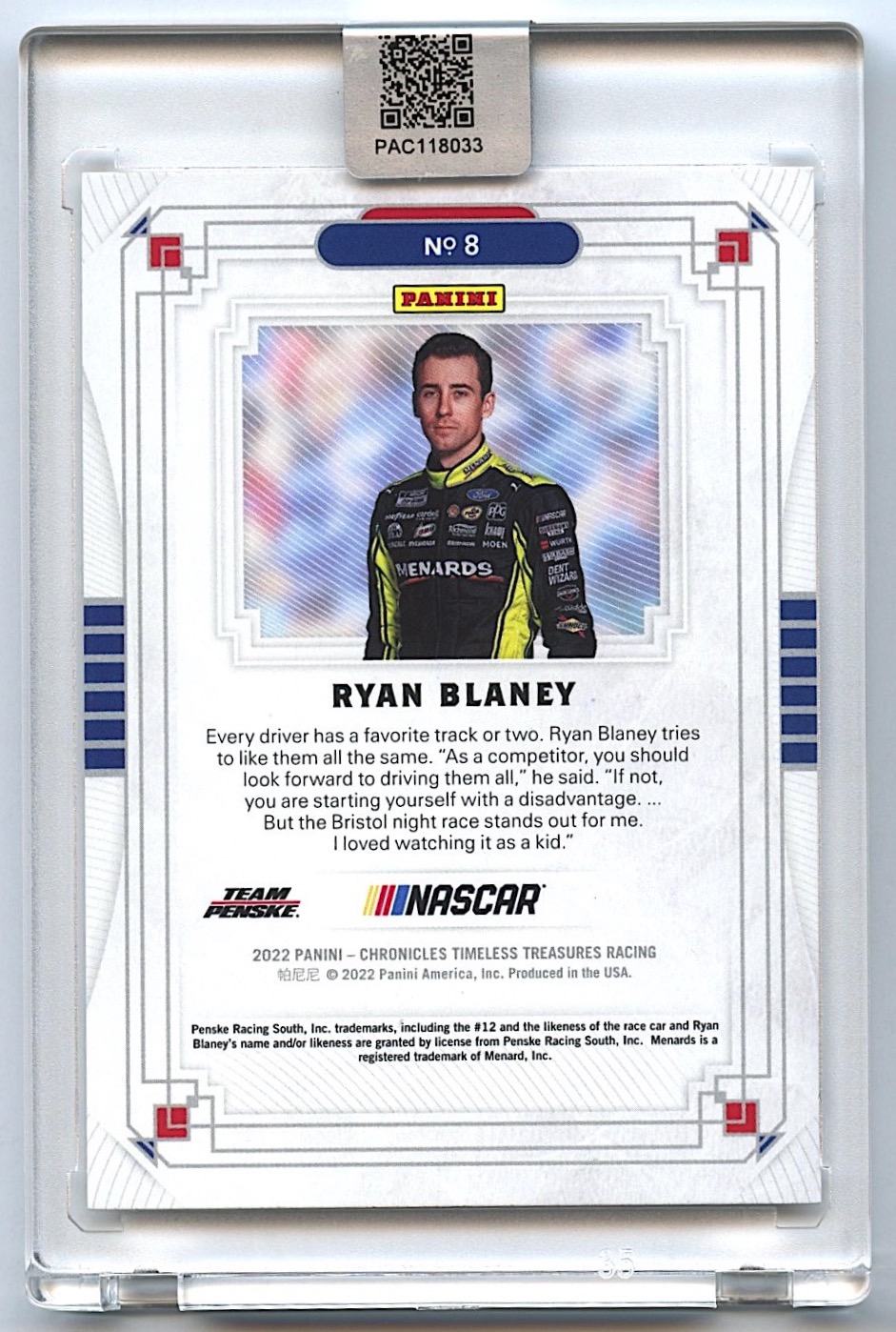 Ryan Blaney Signed 2022 Panini Chronicles Timeless Treasures #8 (PA Encapsulated)