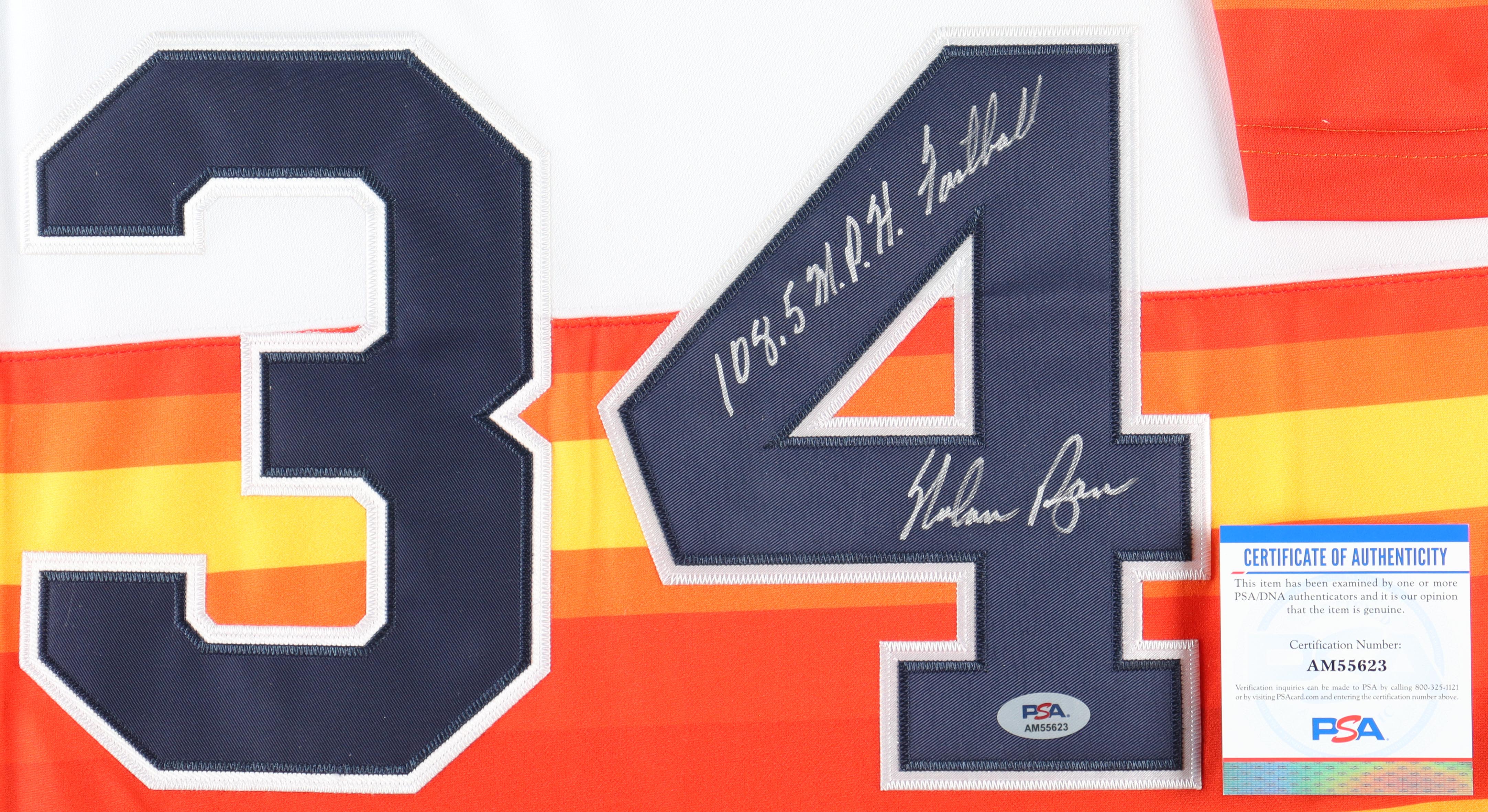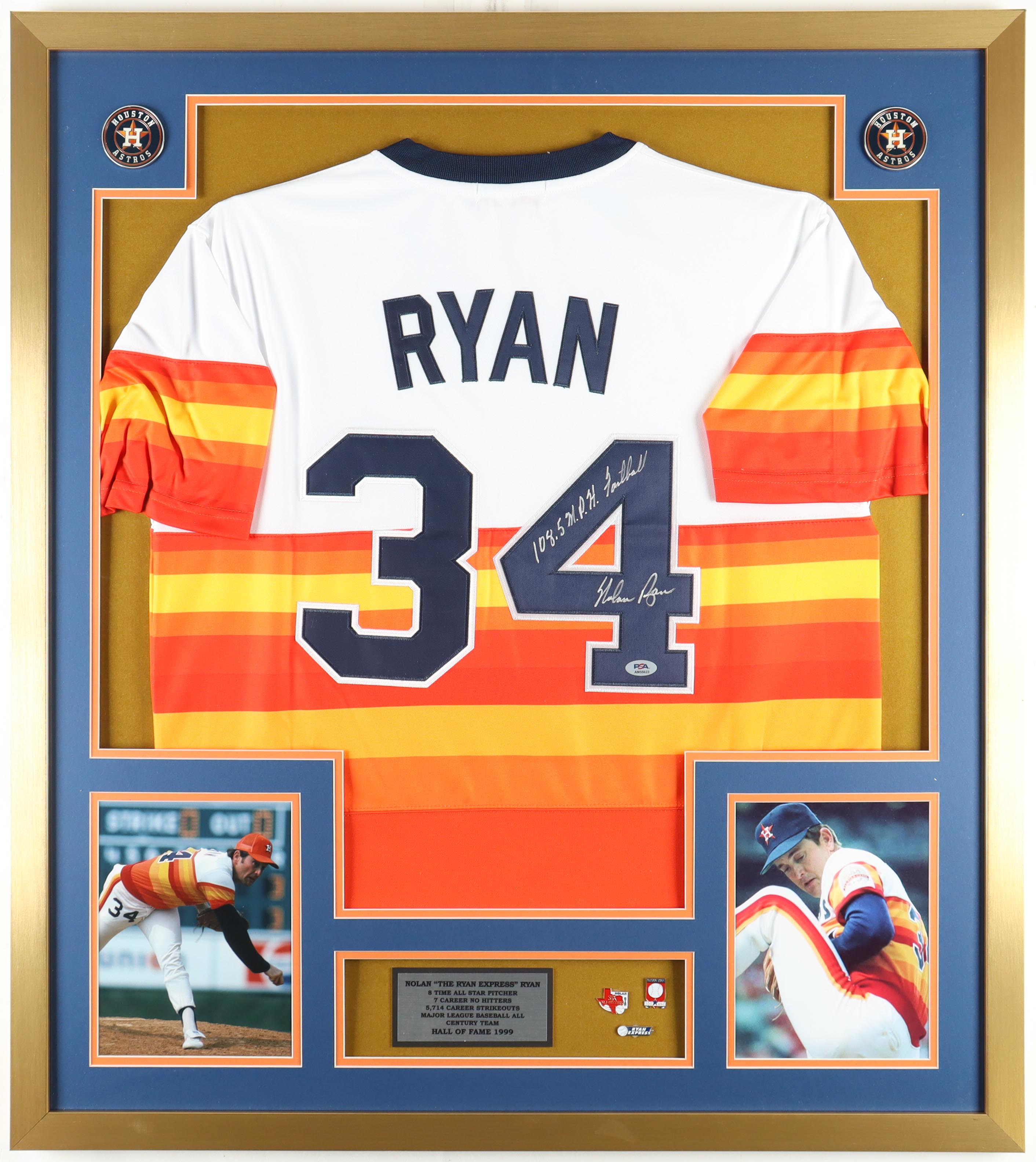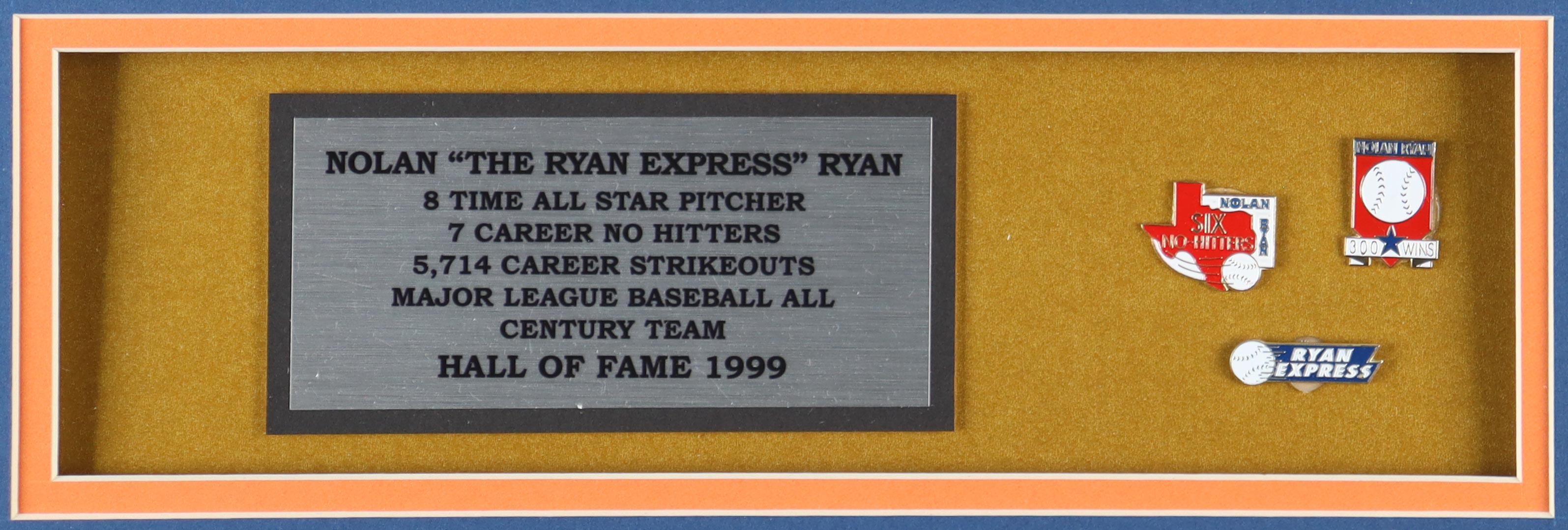 Nolan Ryan Signed Custom Framed Jersey Display With (3) Pins Inscribed "108.5 M.P.H. Fastball" (PSA)