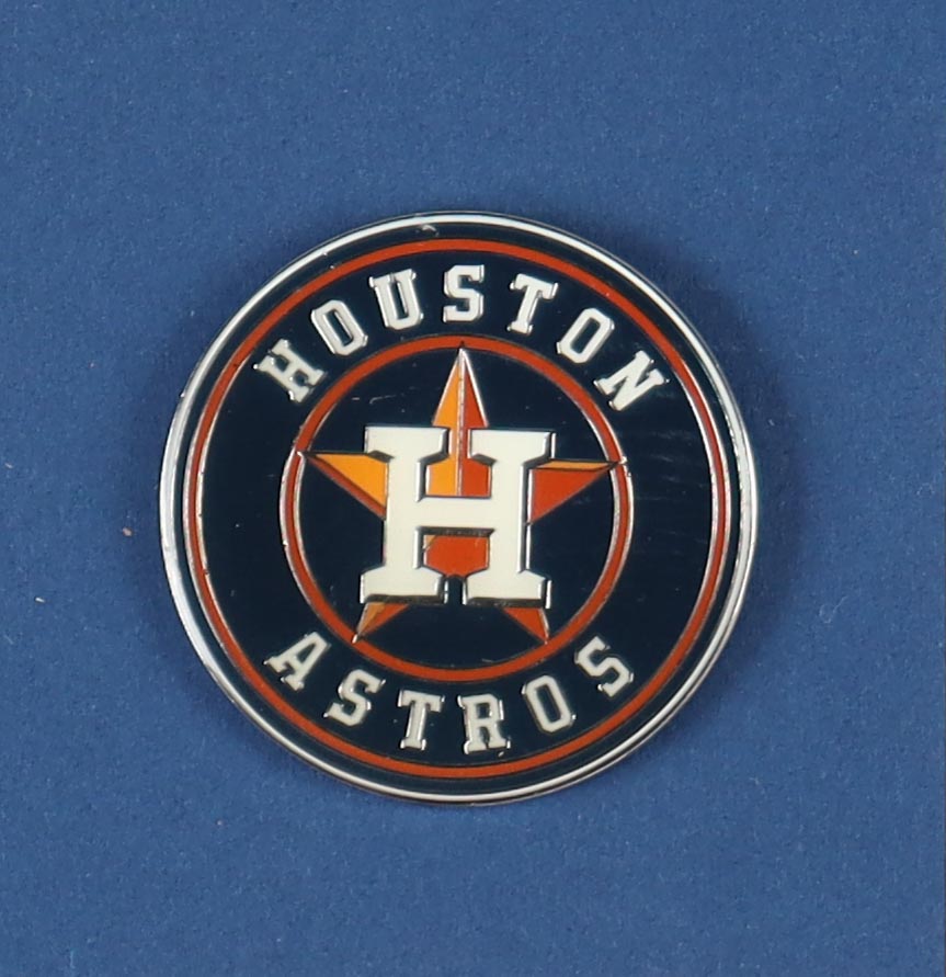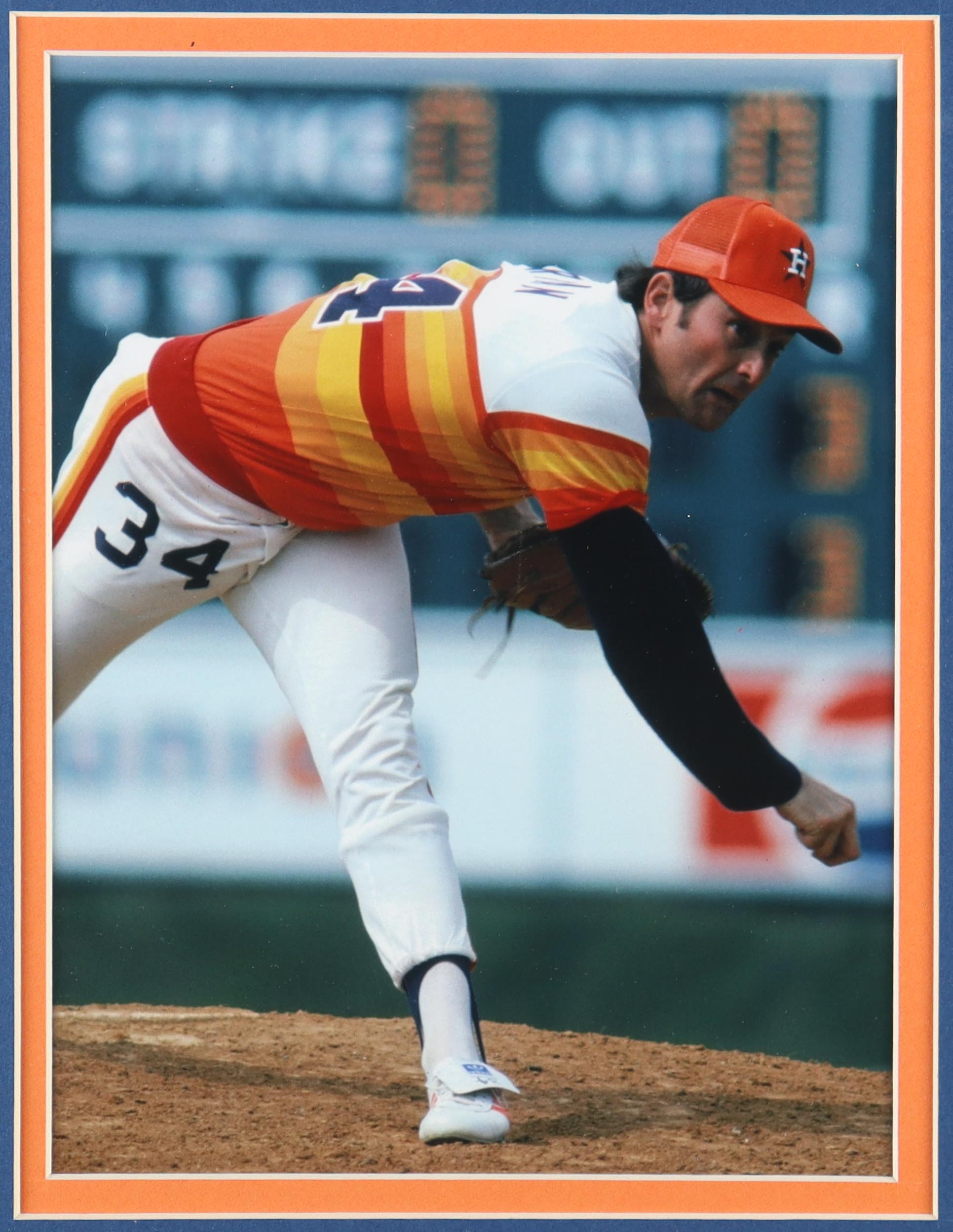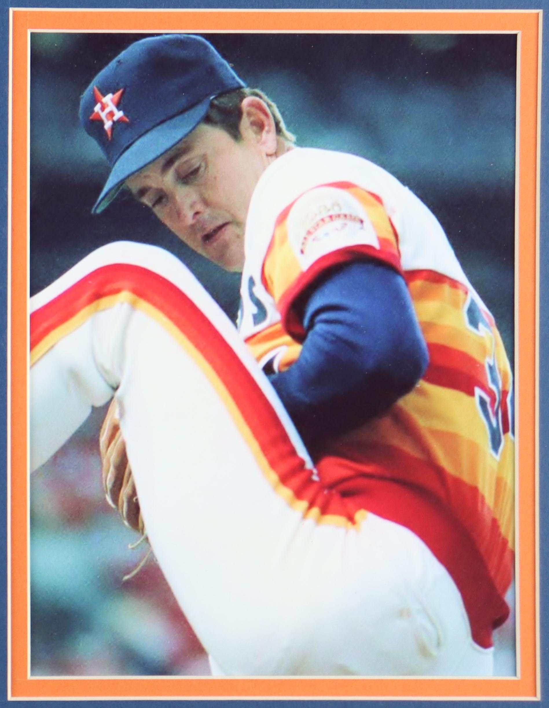 Custom frame measures 32" x 36" in size and features a jersey hand-signed and inscribed by Nolan Ryan (HOF). The display also includes (3) pins and (2) metal Astros Emblems.