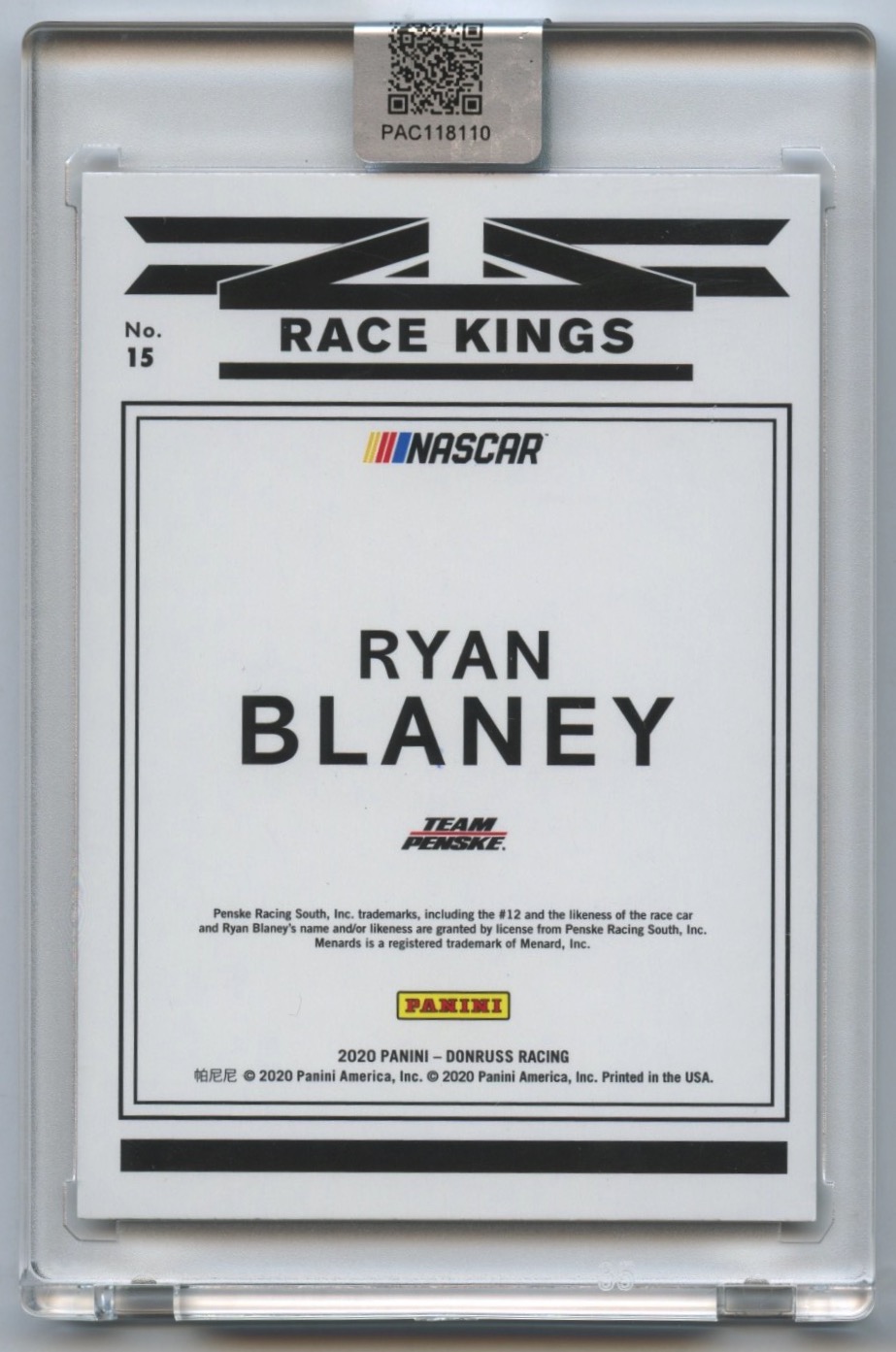 Ryan Blaney Signed 2020 Donruss #15 Race Kings (PA Encapsulated)