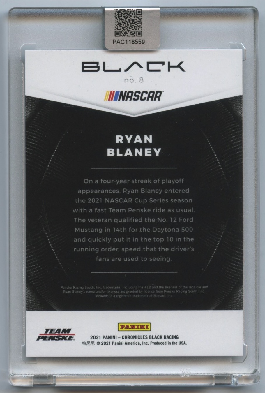 Ryan Blaney Signed 2021 Panini Chronicles Black #8 (PA Encapsulated)