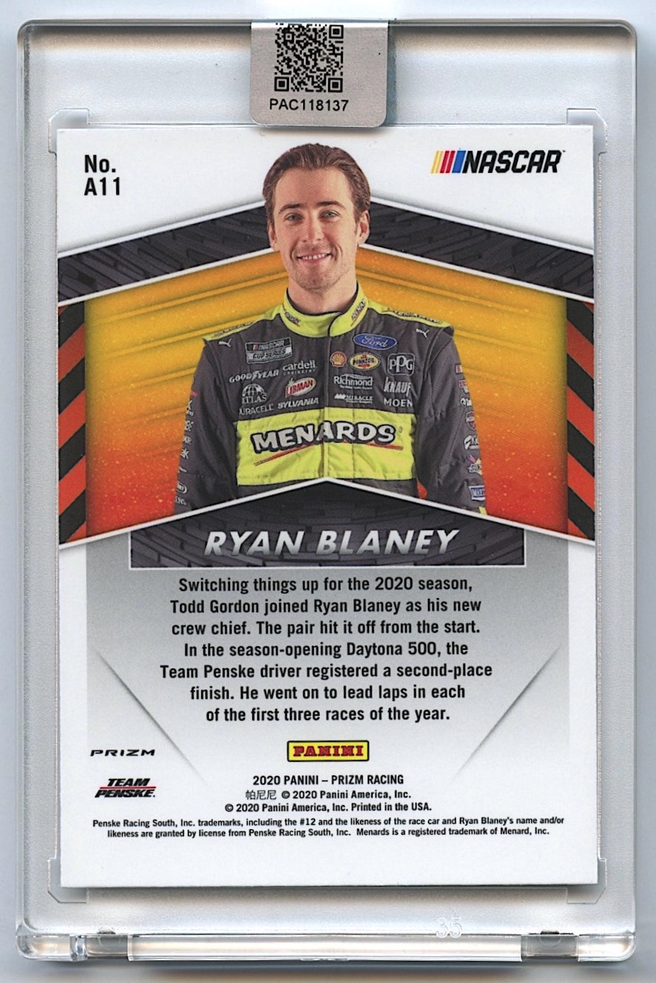 Ryan Blaney Signed 2020 Panini Prizm Apex #11 Prizms Silver (PA Encapsulated)