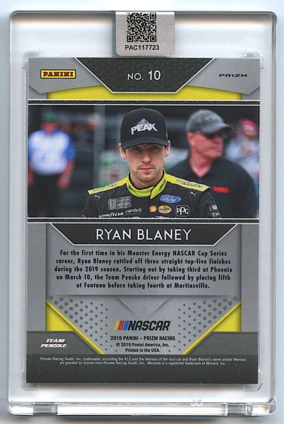 Ryan Blaney Signed 2019 Panini Prizm #10 Prizms Camo (PA Encapsulated)