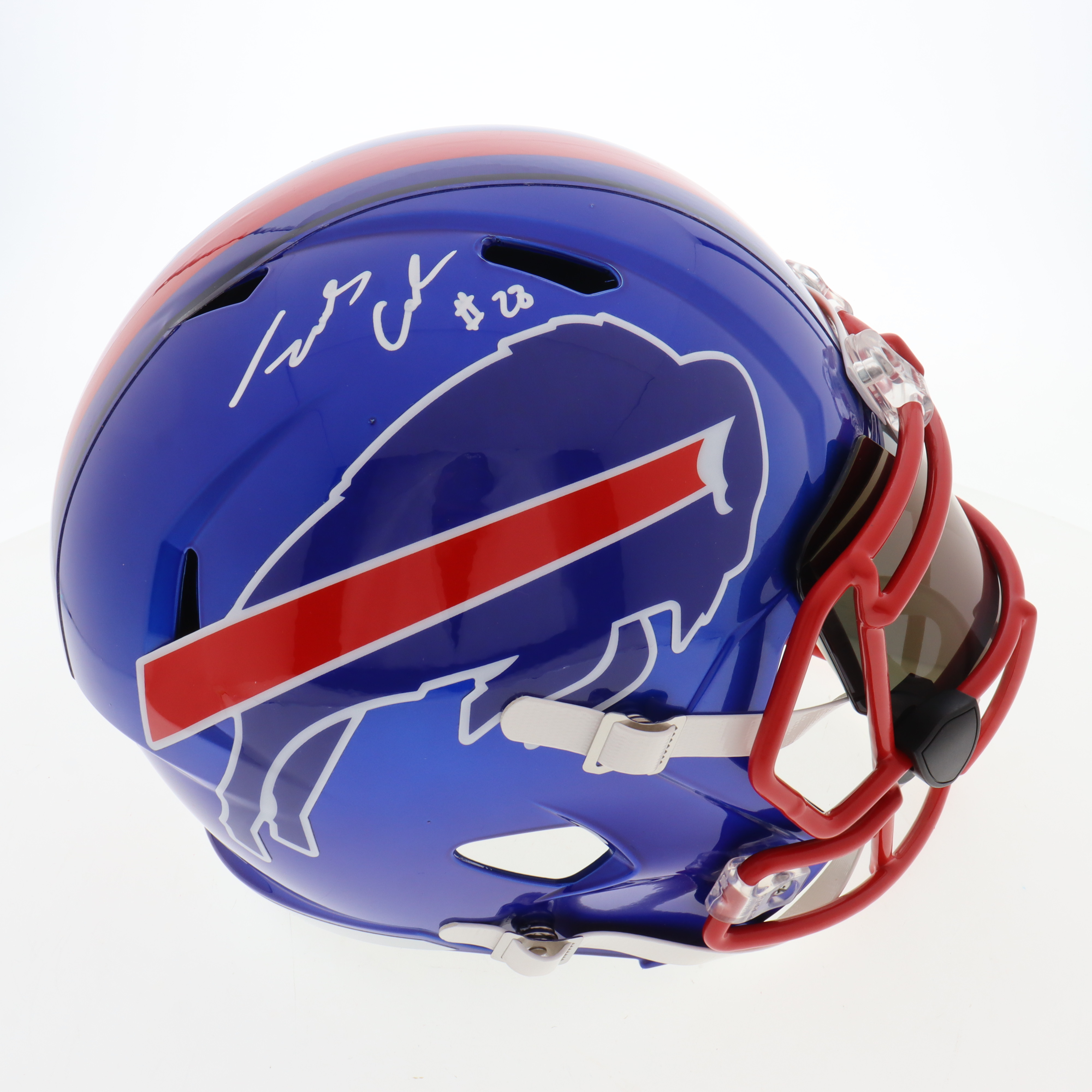 Riddell Buffalo Bills full-size replica Flash Alternate Speed helmet with visor. Hand-signed by James Cook.