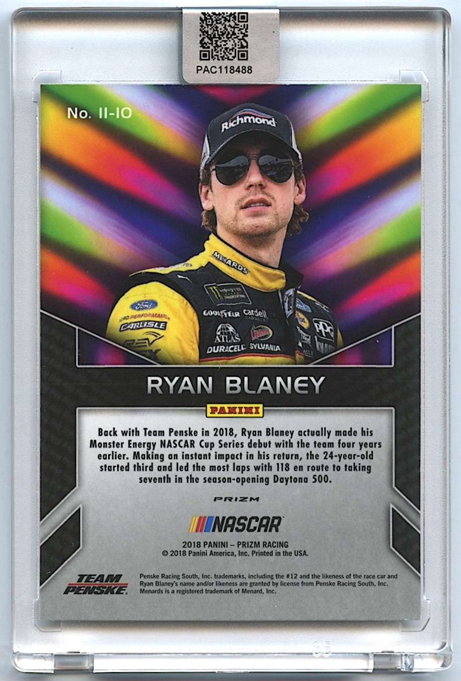 Ryan Blaney Signed 2018 Panini Prizm Instant Impact #10 Prizms Silver (PA Encapsulated)