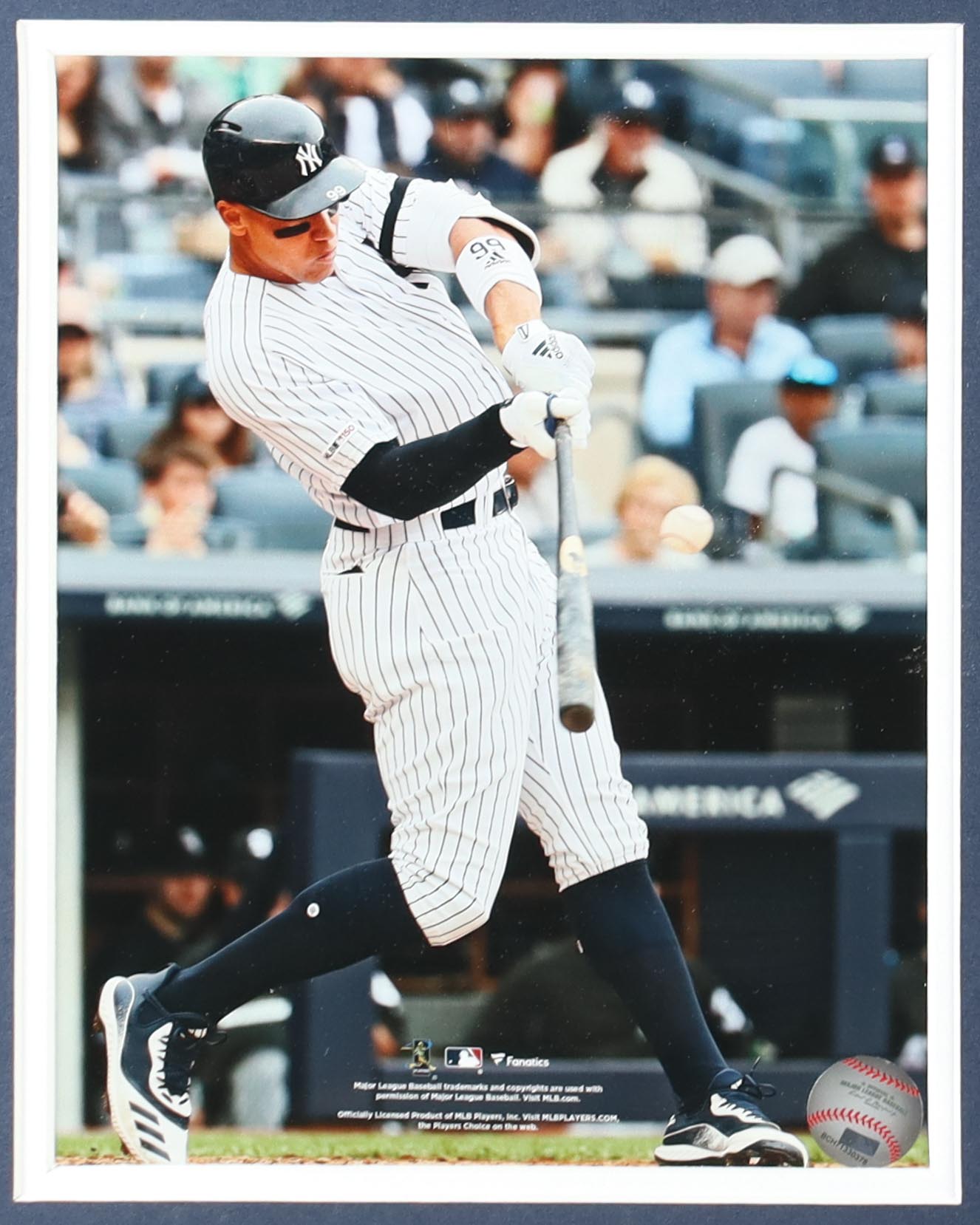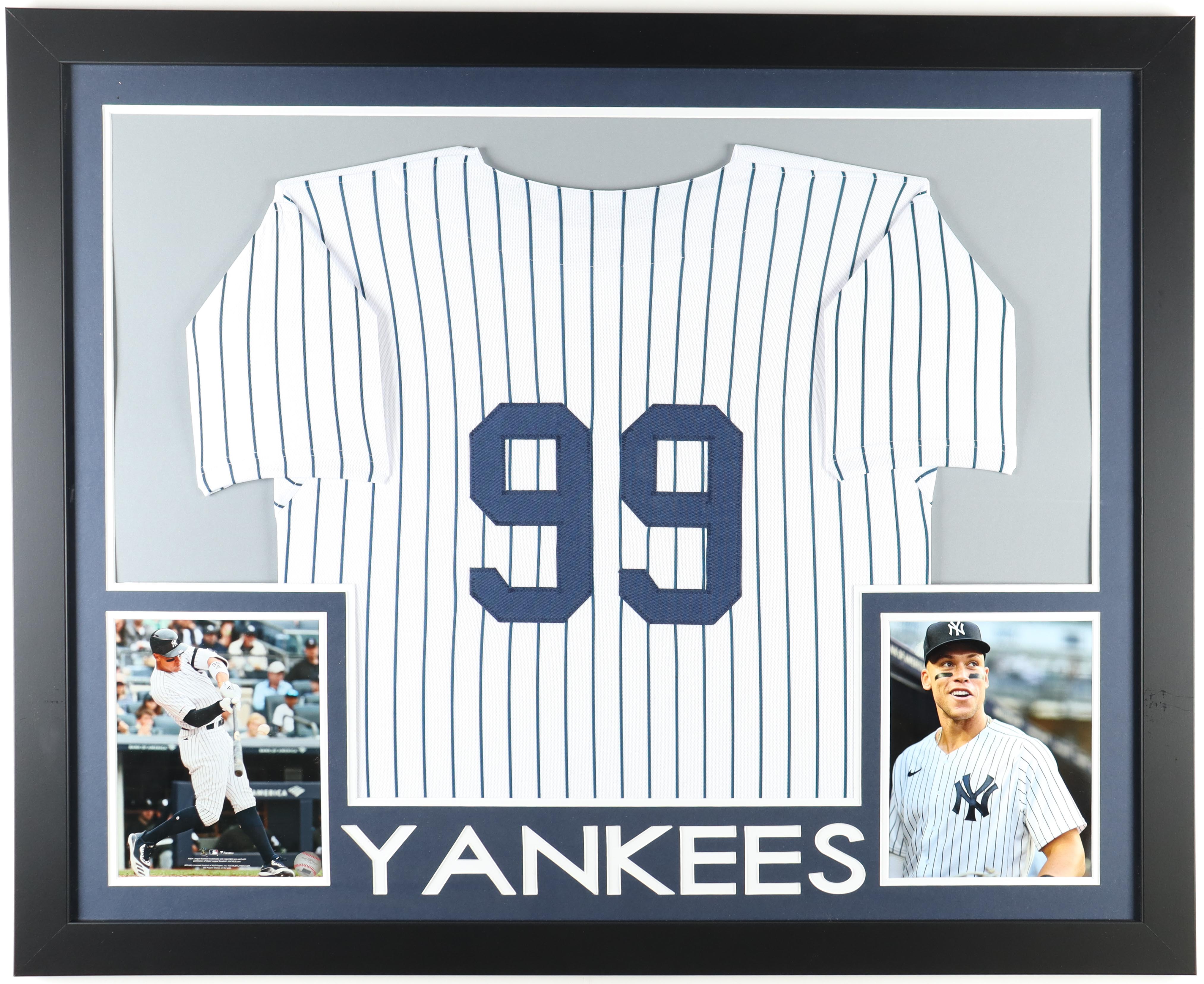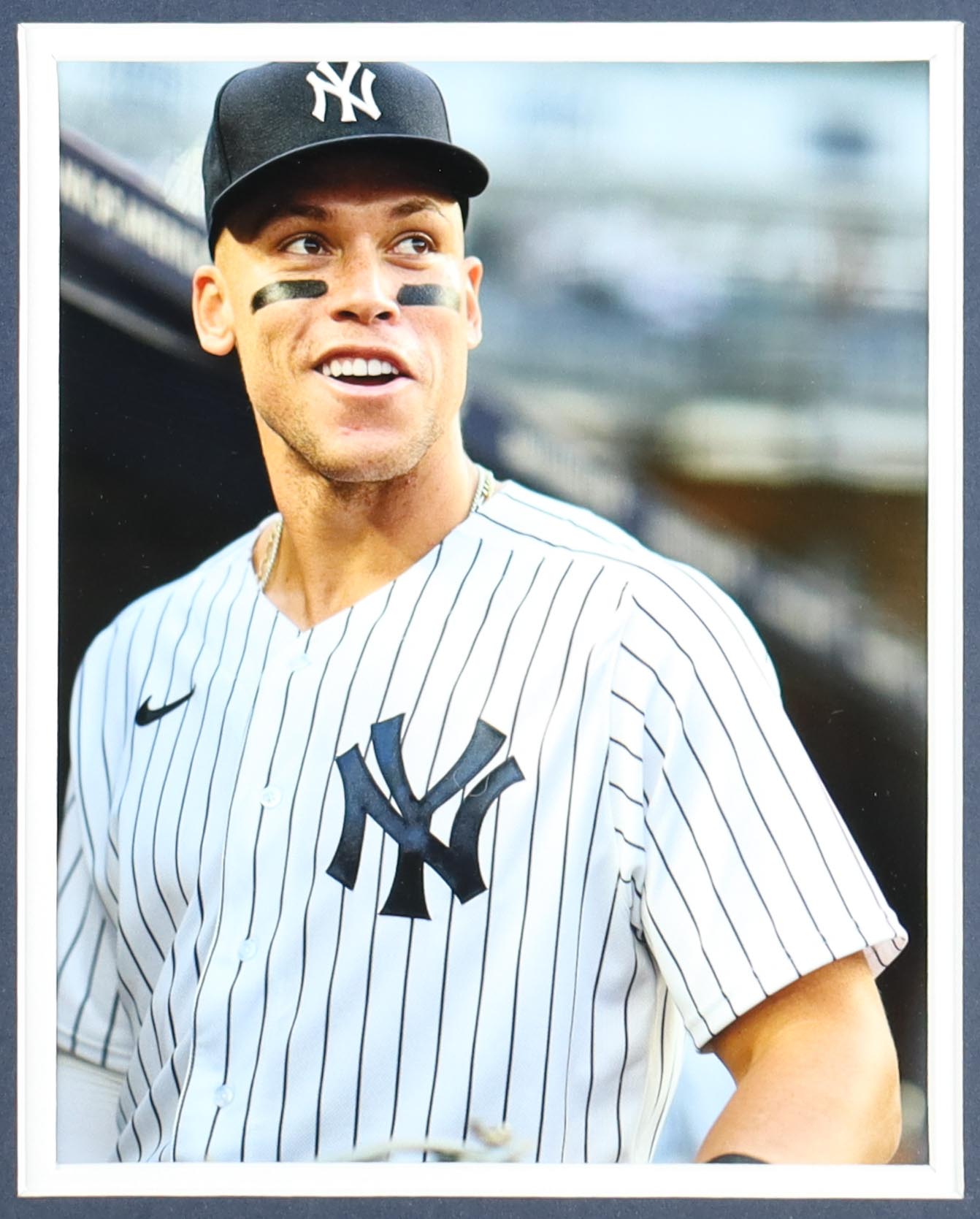 Custom display measures approximately 35" x 43" in size. Features a custom unsigned Aaron Judge jersey. Please note, the jersey is unsigned and the 8" x 10" photos may be in different order.