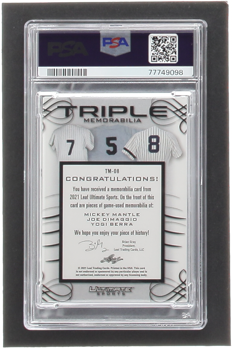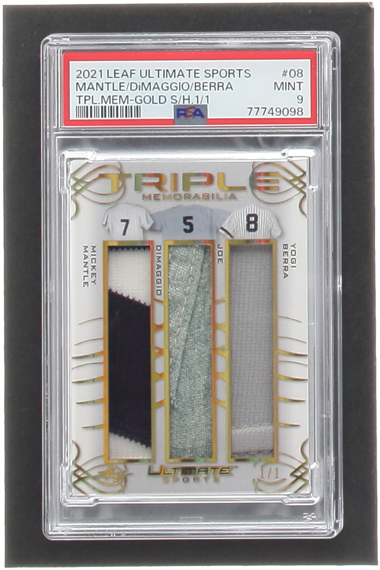 Mickey Mantle / Joe DiMaggio / Yogi Berra 2021 Leaf Ultimate Sport Triple Memorabilia Gold #TM08 #1/1 (PSA 9)