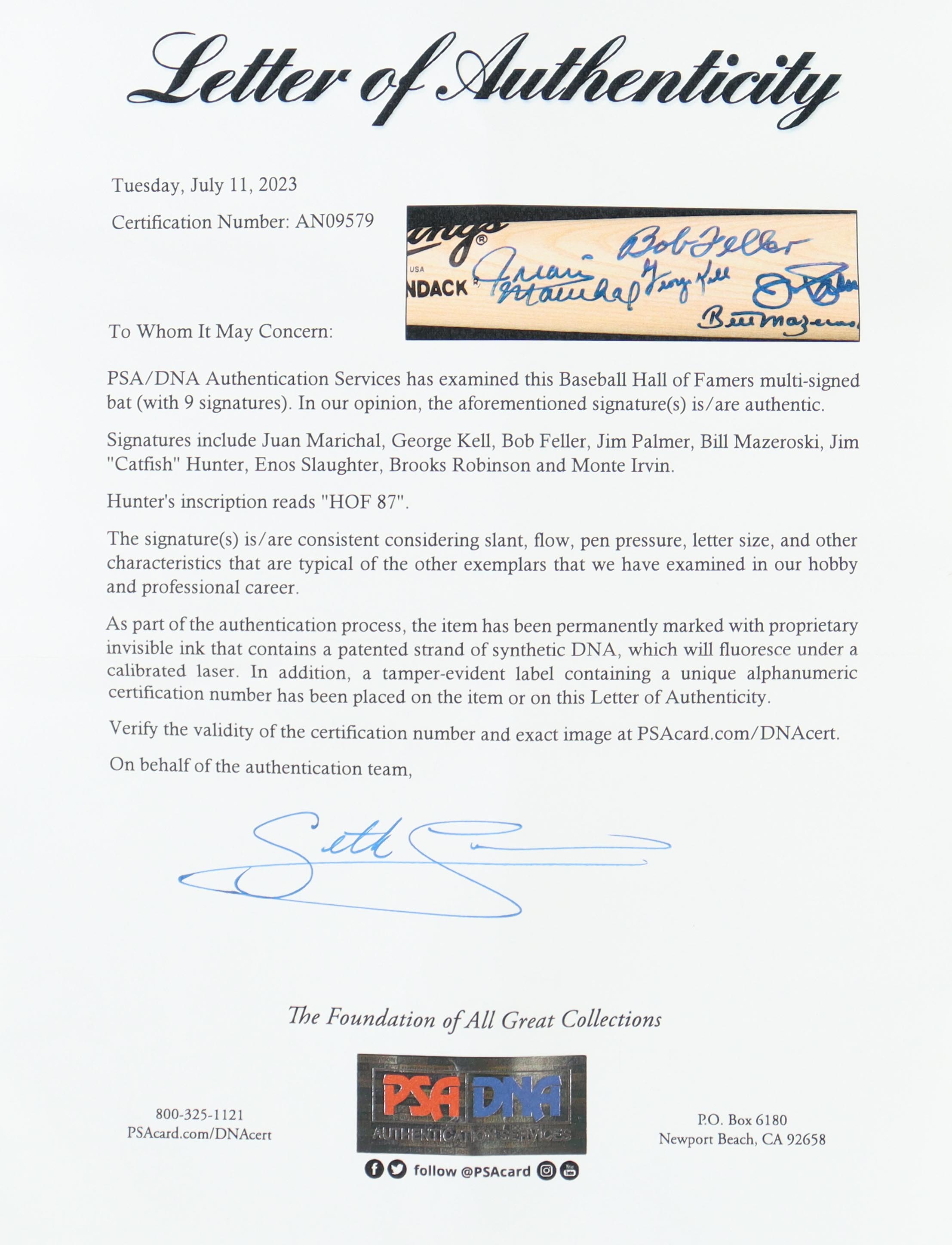 Rawlings Big Stick Adirondack Pro Baseball Bat. Hand-signed and inscribed by "Catfish" Hunter, Enos Slaughter, Bob Feller, Monte Irvin, George Kell, Juan Marichal, Bill Mazeroski, Jim Palmer and Brooks Robinson.