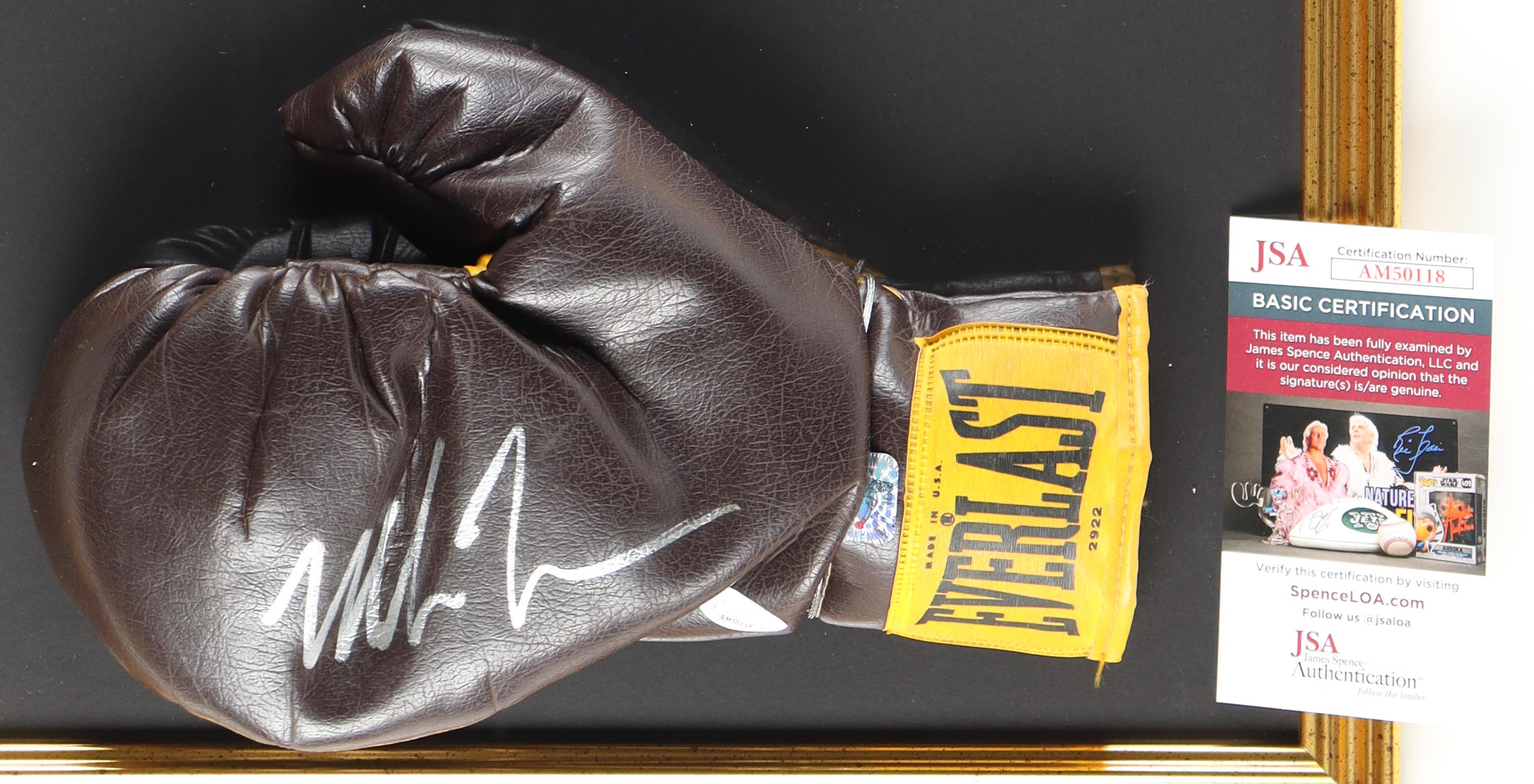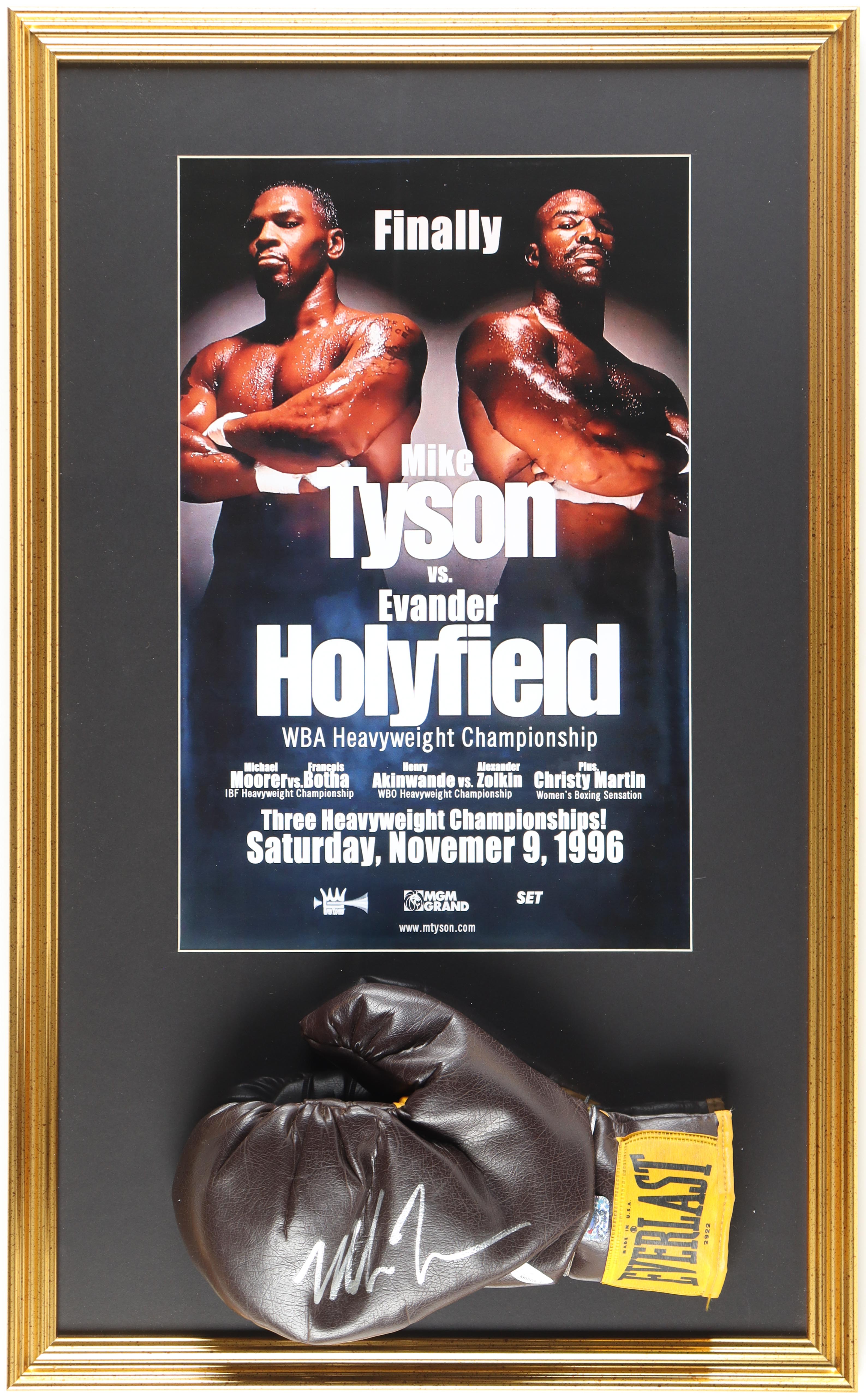 Custom frame measures 18" x 29" in size and features a vintage Everlast boxing glove that has been hand-signed by Mike Tyson (HOF).