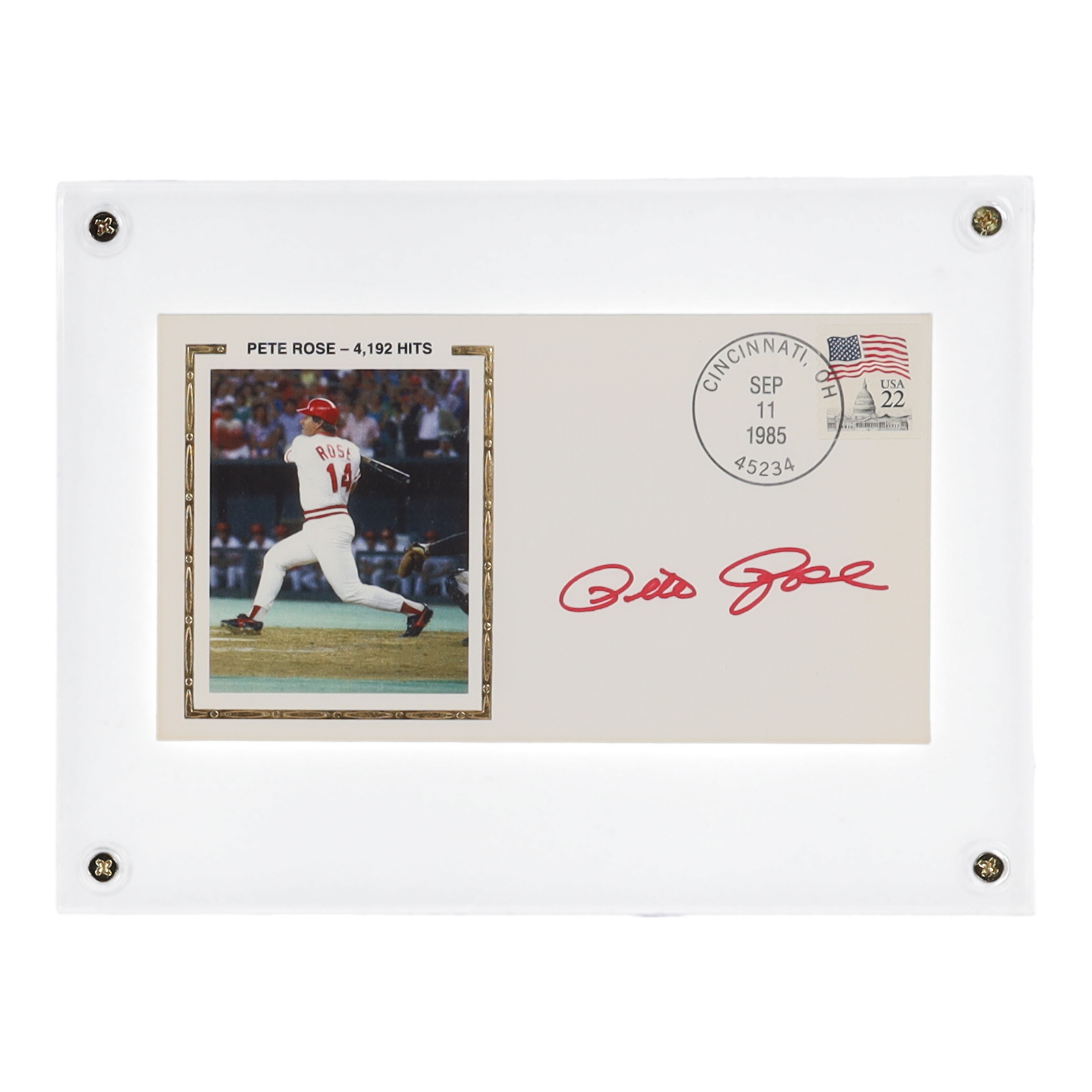 First Day Cover envelope dated September 11, 1985. Hand-signed by Pete Rose (Cincinnati Reds). Shipped encapsulated as shown.