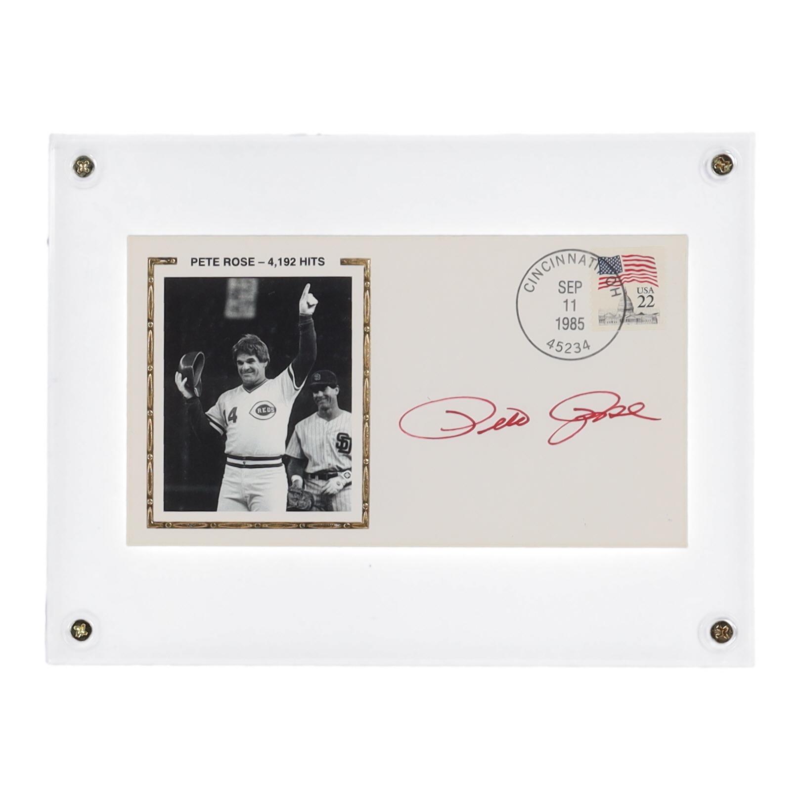 First Day Cover envelope dated September 11, 1985. Hand-signed by Pete Rose (Cincinnati Reds). Shipped encapsulated as shown.