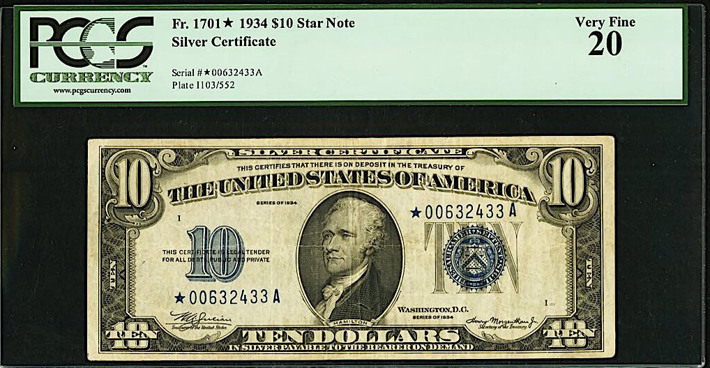 1934 $10 Ten Dollar Star Note Silver Certificate Bank Note Bill (PCGS 20)
