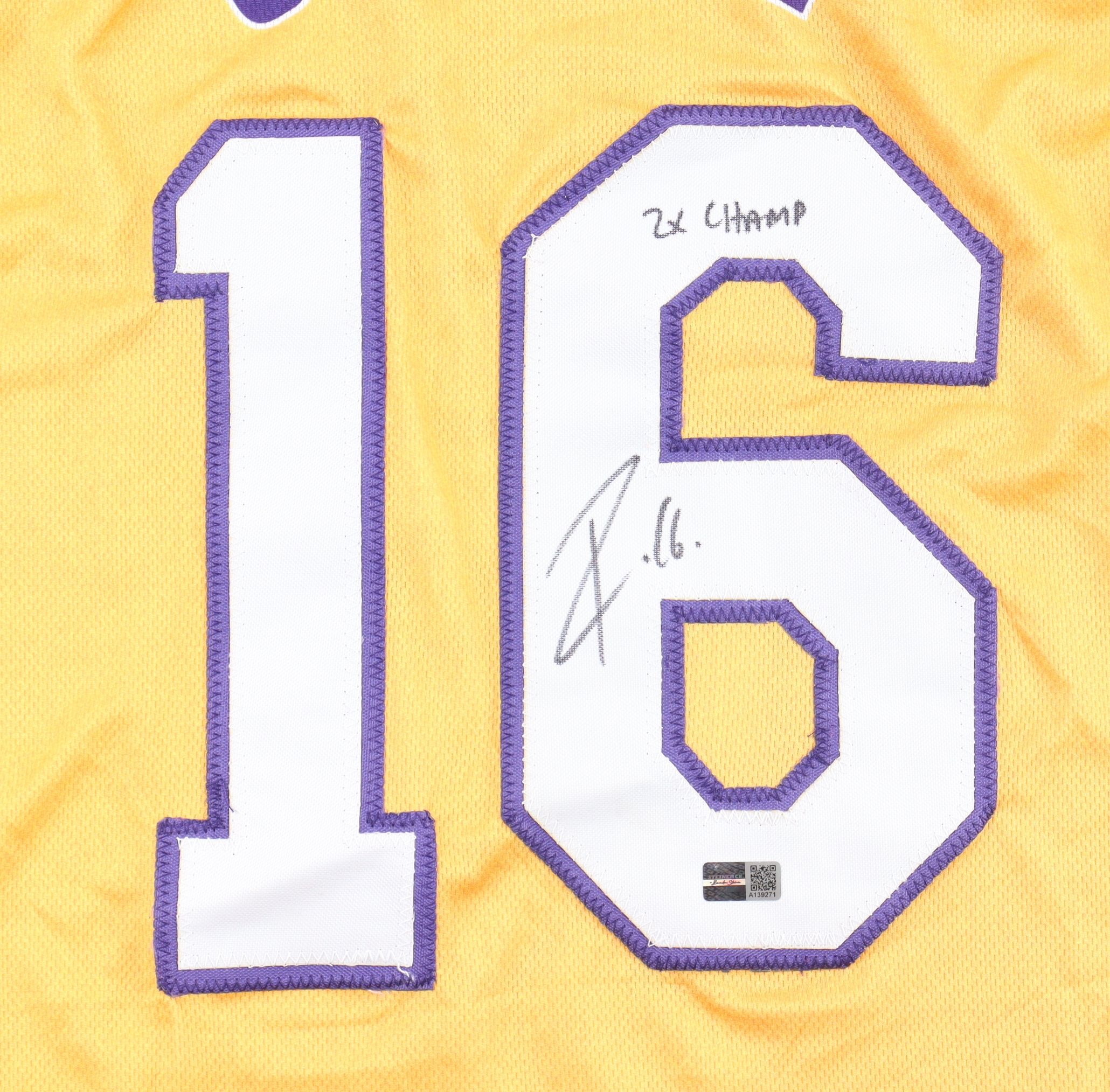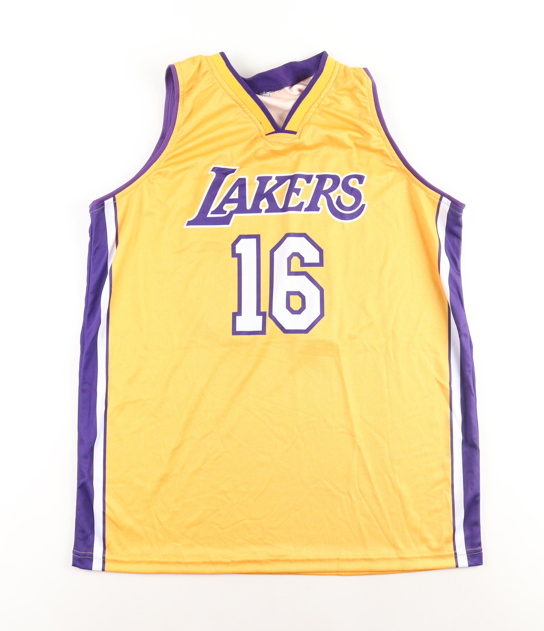 Custom jersey with everything sewn on, size XL. Hand-signed and inscribed by Pau Gasol (HOF).
