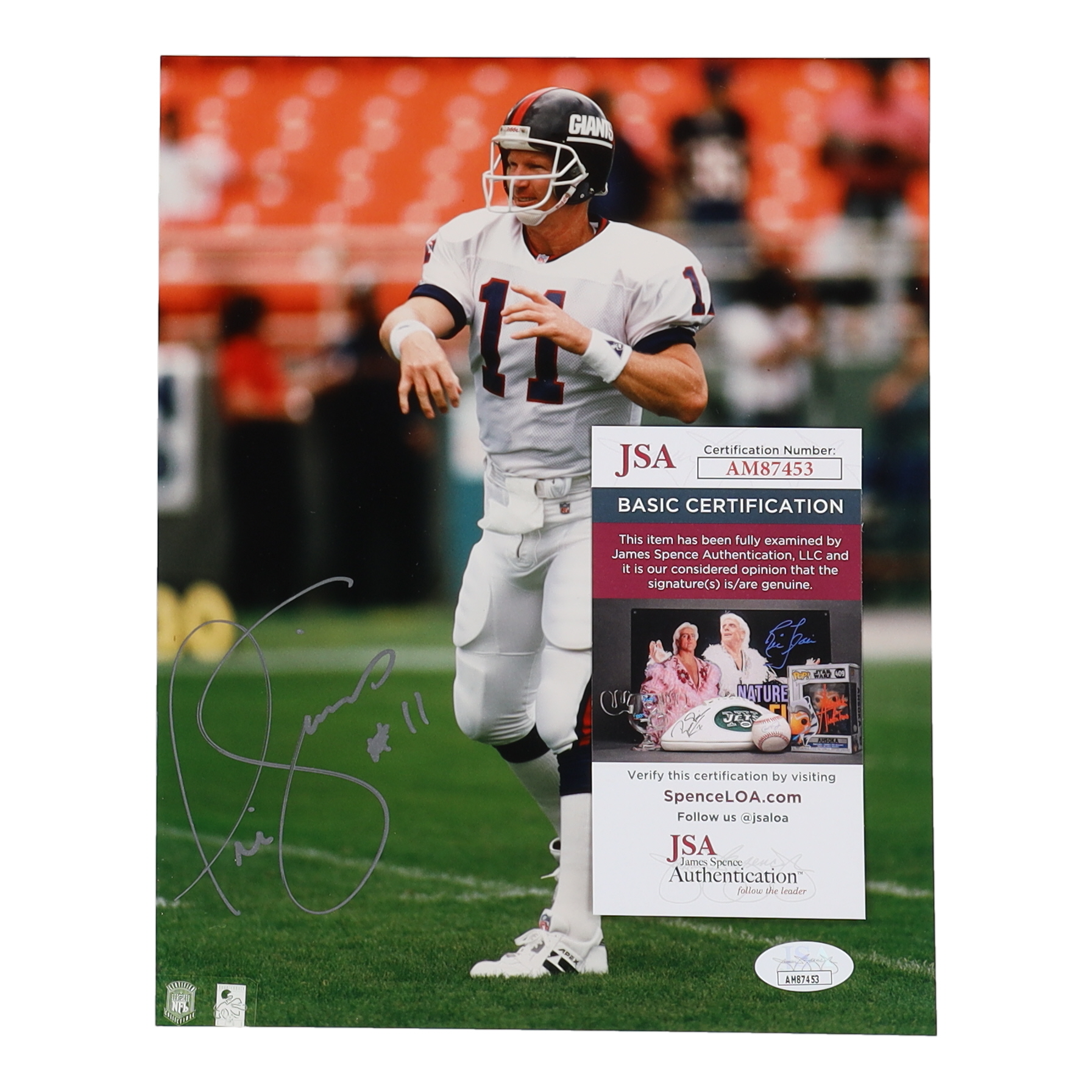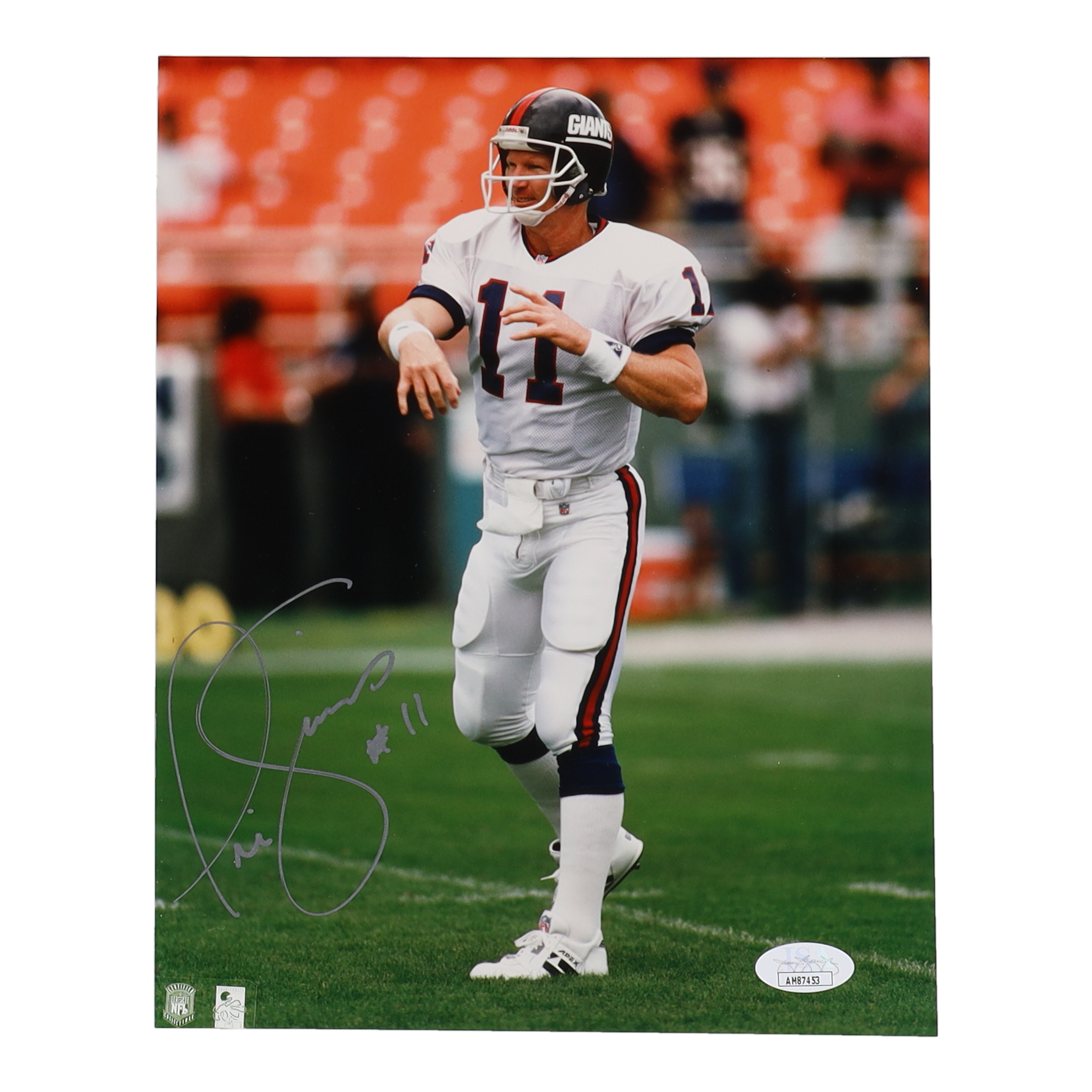 Photo measures 8" x 10" in size and has been hand-signed by Phil Simms (New York Giants).
