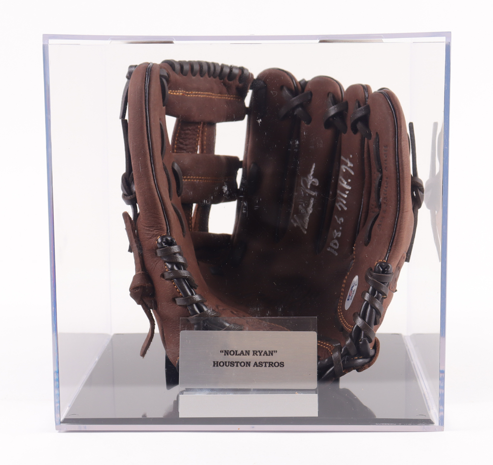 Rawlings baseball glove has been hand-signed and inscribed by Nolan Ryan (Houston Astros, HOF). Includes display case as shown.
