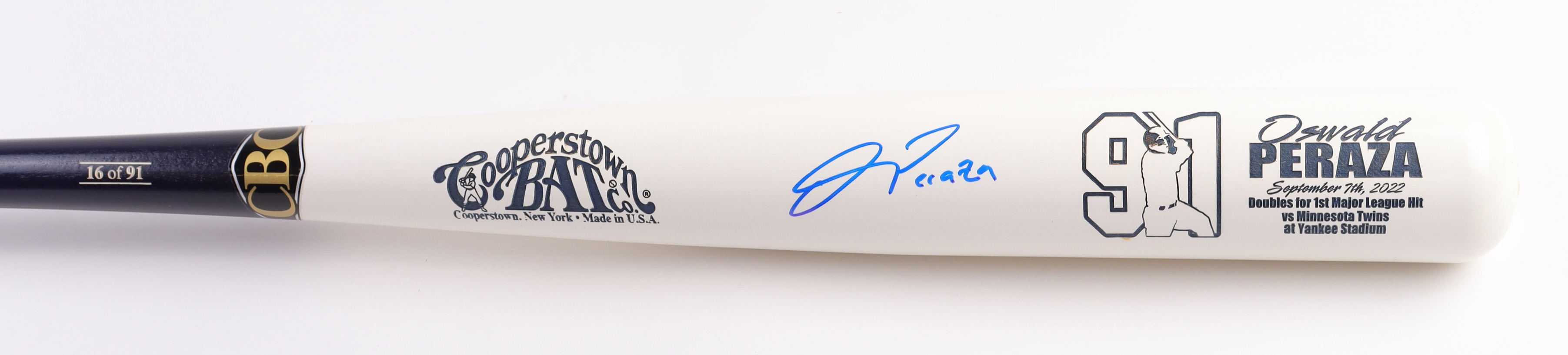 Cooperstown Collection baseball bat has been hand-signed by Oswald Peraza (New York Yankees). Bat is limited edition numbered # / 91