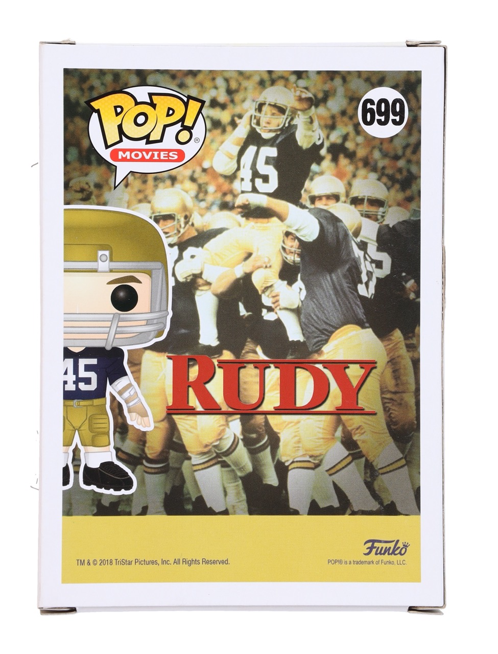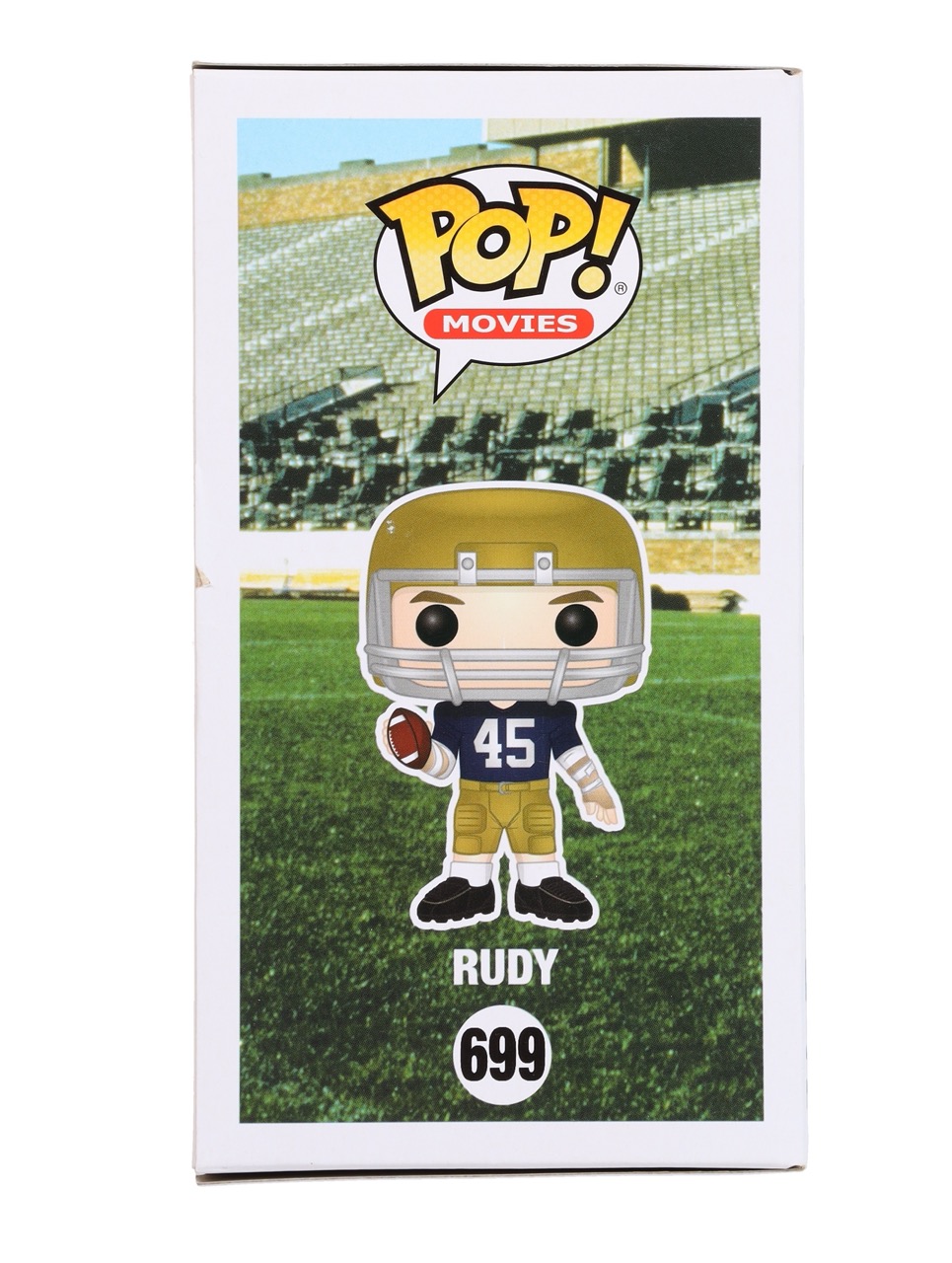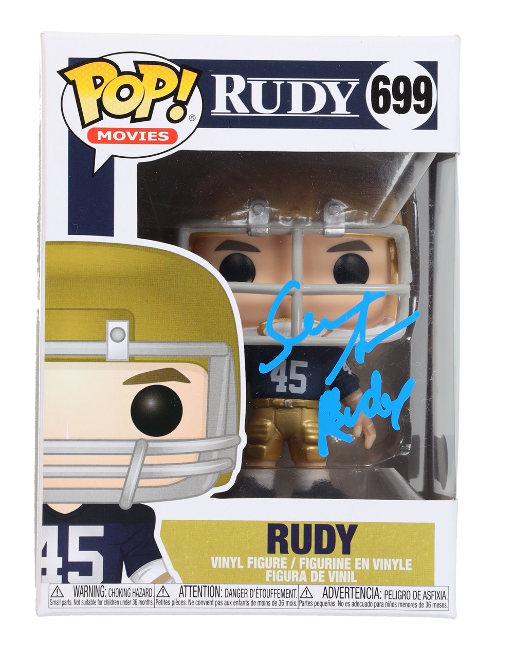 Funko Pop! figure measures approximately 4" tall. Hand-signed and inscribed on the packaging by Sean Astin (Rudy Ruettiger).