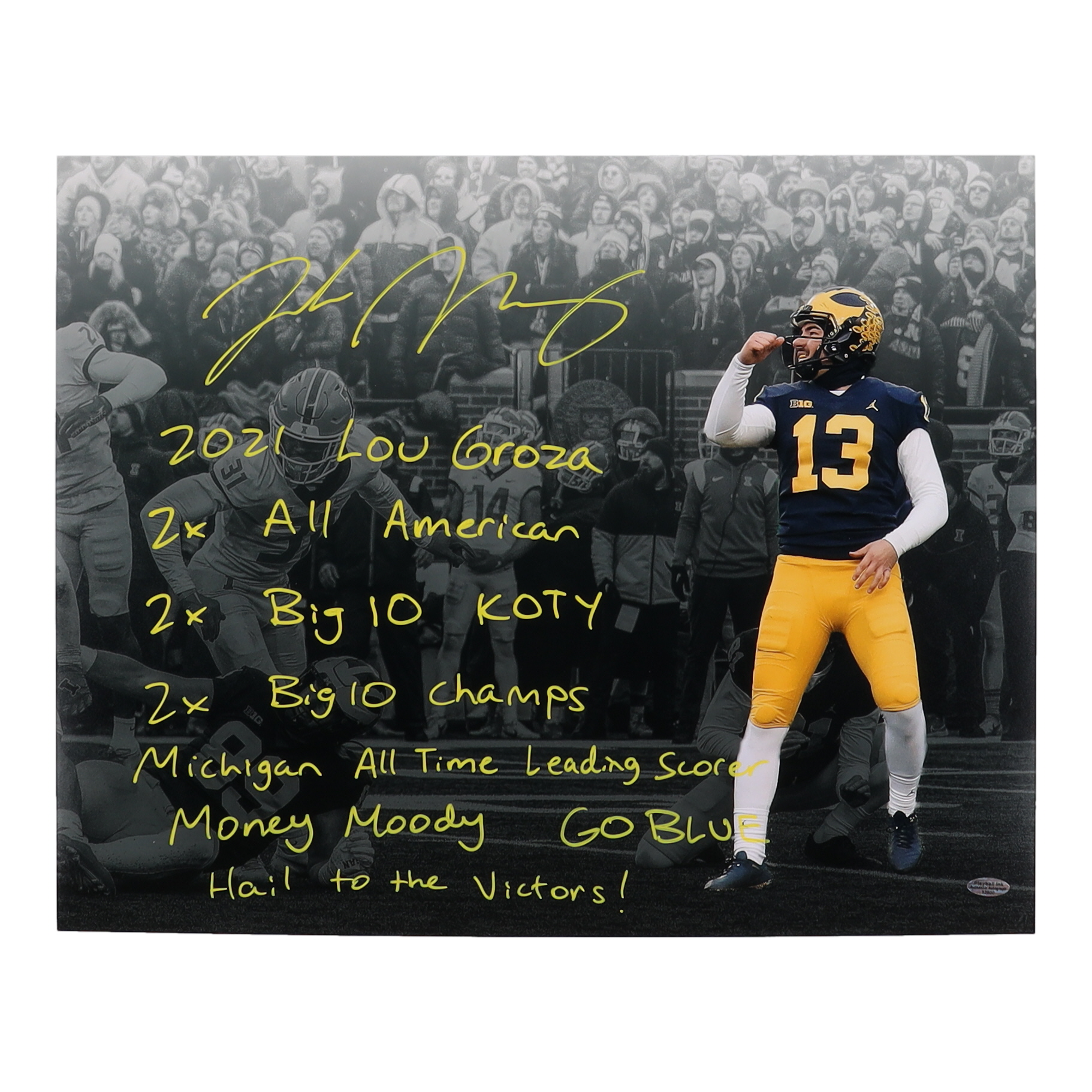 Jake Moody Signed Michigan Wolverines 16x20 Photo with Extensive Inscription (Playball Ink)