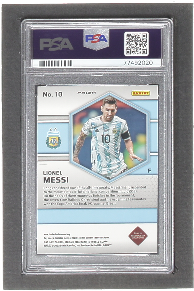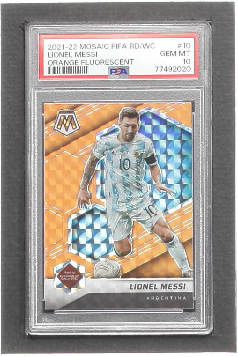 Lionel Messi 2021-22 Panini Mosaic Road to the FIFA World Cup Qatar Mosaic Orange Fluorescent #10 (PSA 10)
