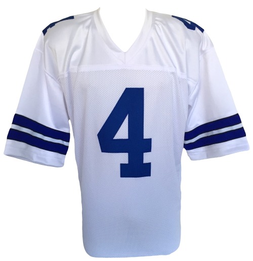 Custom on field style jersey. Everything sewn on, size XL. Jersey has been hand-signed in silver paint pen by Dak Prescott.