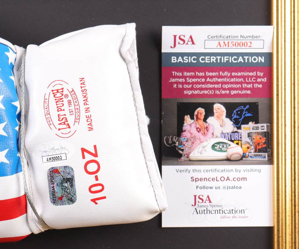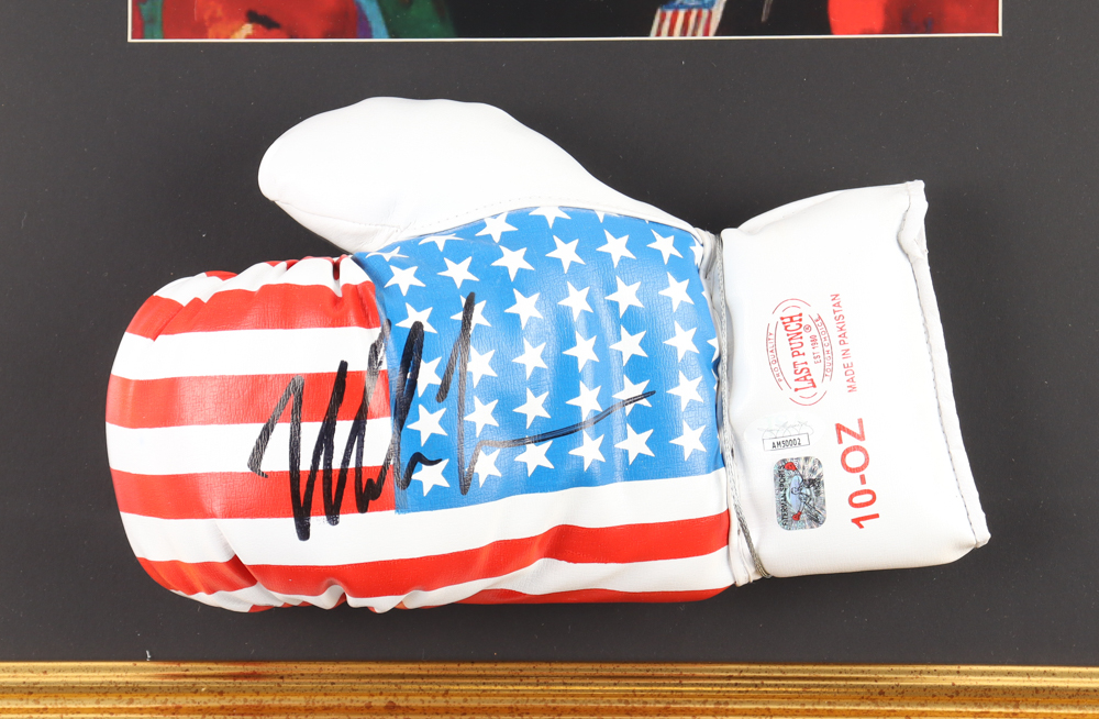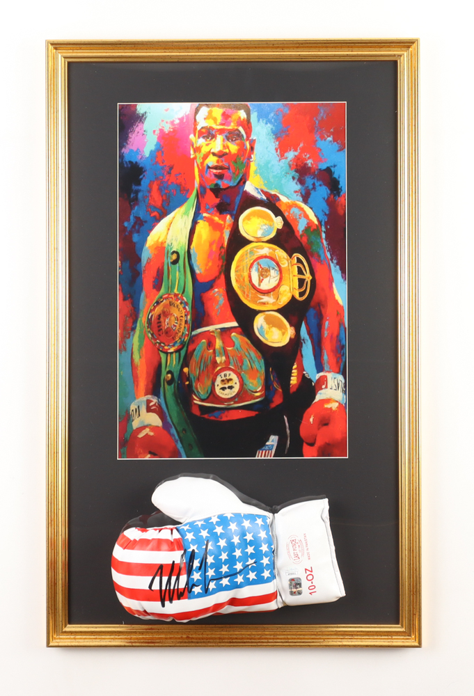 Custom frame measures approximately 18" x 29" in size and features a Last Punch boxing glove that has been hand-signed by Mike Tyson (HOF). The display also includes an art print of Tyson.
