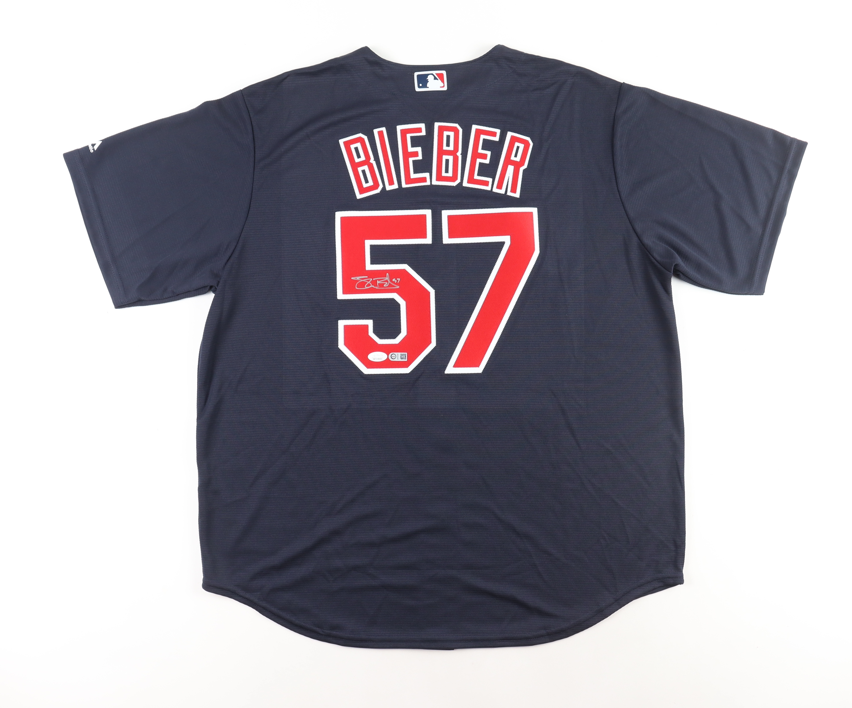 Majestic jersey with everything sewn on, size XL. Hand-signed by Shane Bieber (Cleveland Guardians).