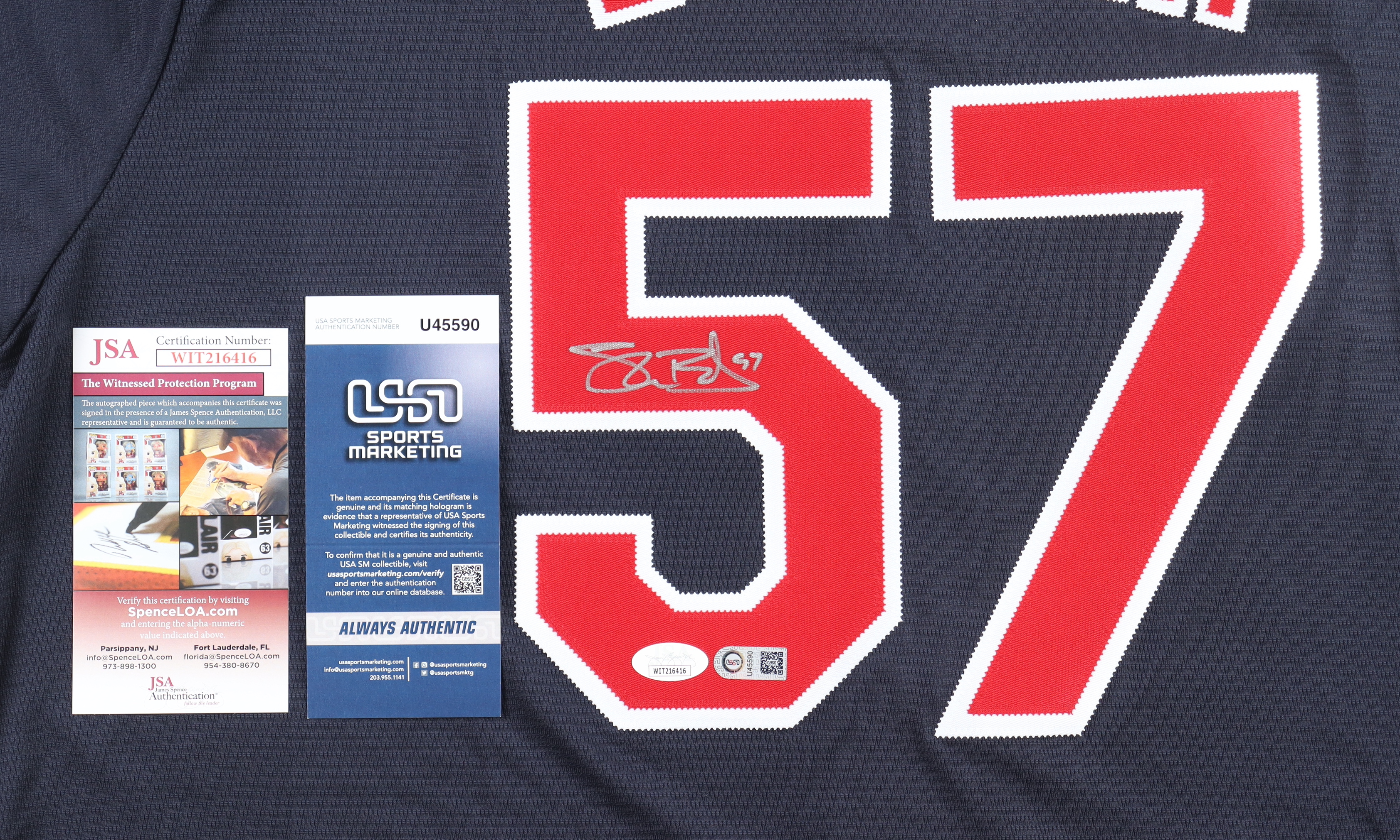 The autograph(s) includes an official James Spence Authentication (JSA) hologram and matching COA as well as an official USA Sports Marketing hologram and matching COA for authenticity purposes. The signing of this item was witnessed by JSA.