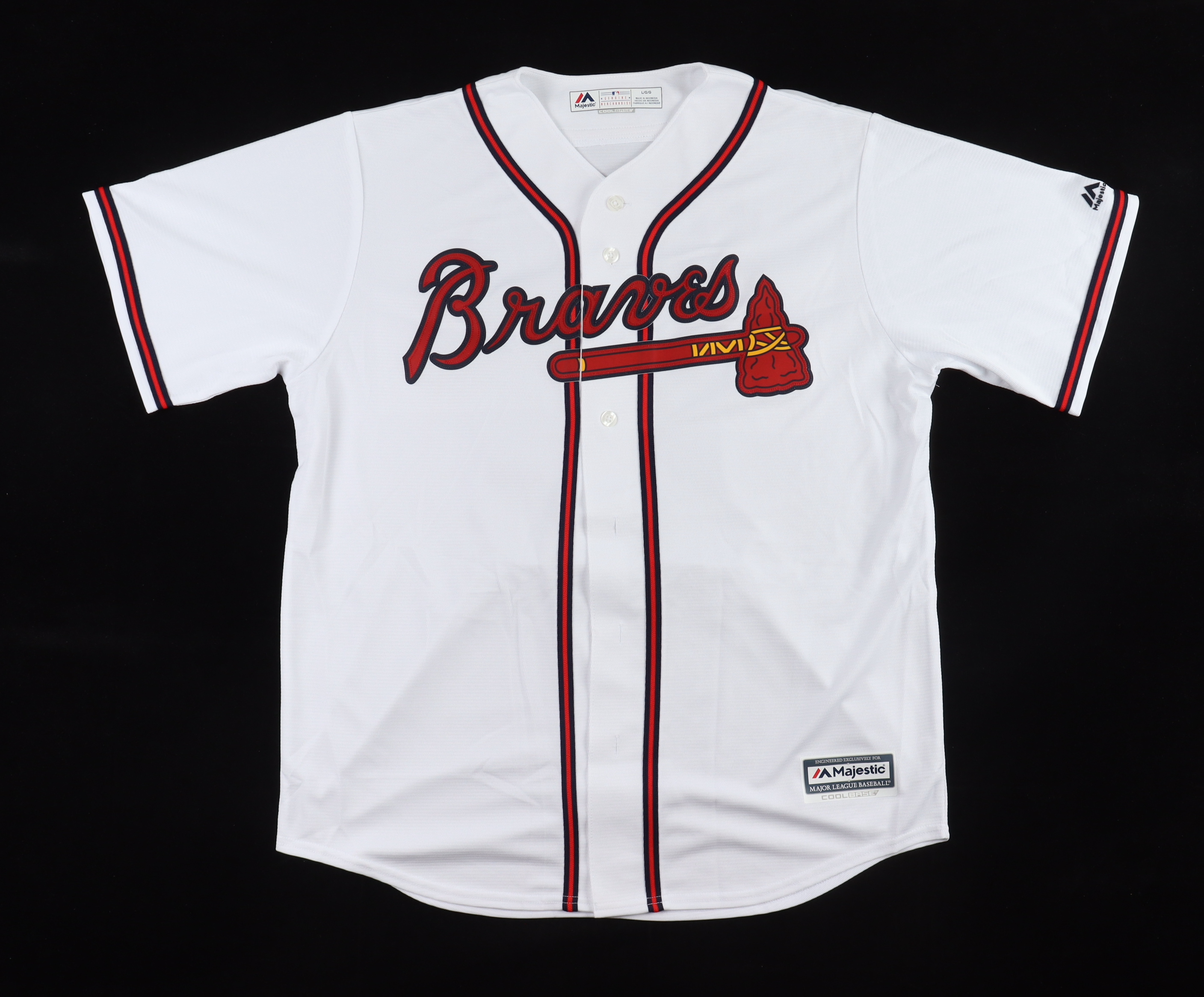 Majestic jersey with everything sewn on, size L. Hand-signed by Ronald Acuna Jr. (Atlanta Braves).