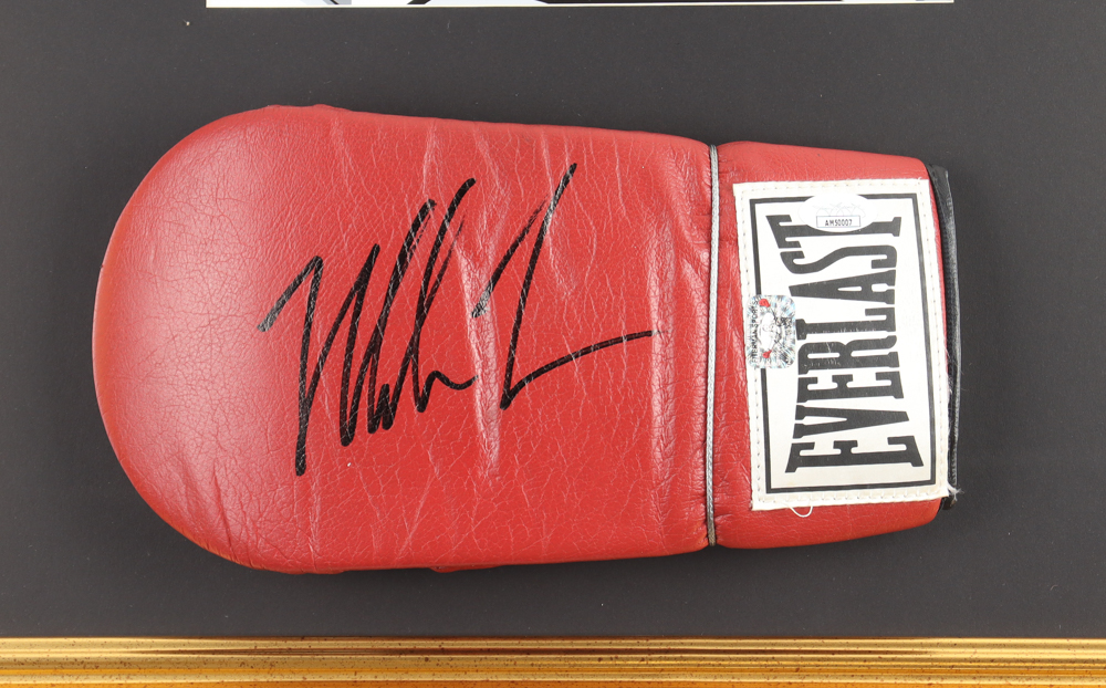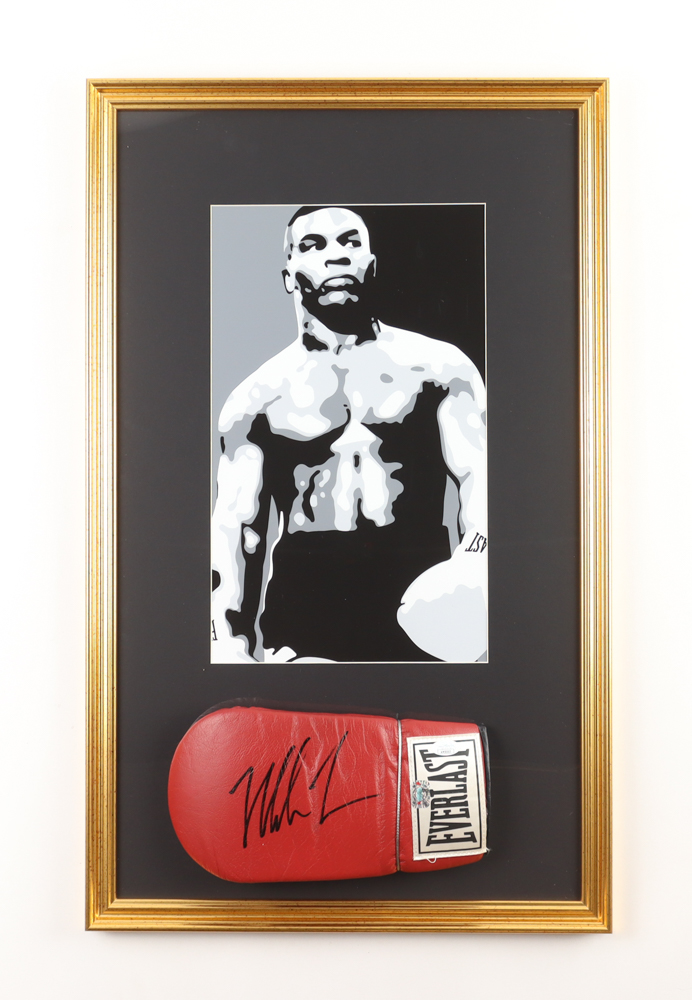 Custom frame measures 18" x 29" in size and features an Everlast sparring glove that has been hand-signed by Mike Tyson (HOF). The display also includes a black and white art print of Tyson.