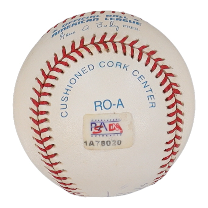 Rawlings Official American League baseball. Hand-signed and inscribed by Bert Blyleven (Minnesota Twins, HOF). Please note, the baseball is naturally toned.