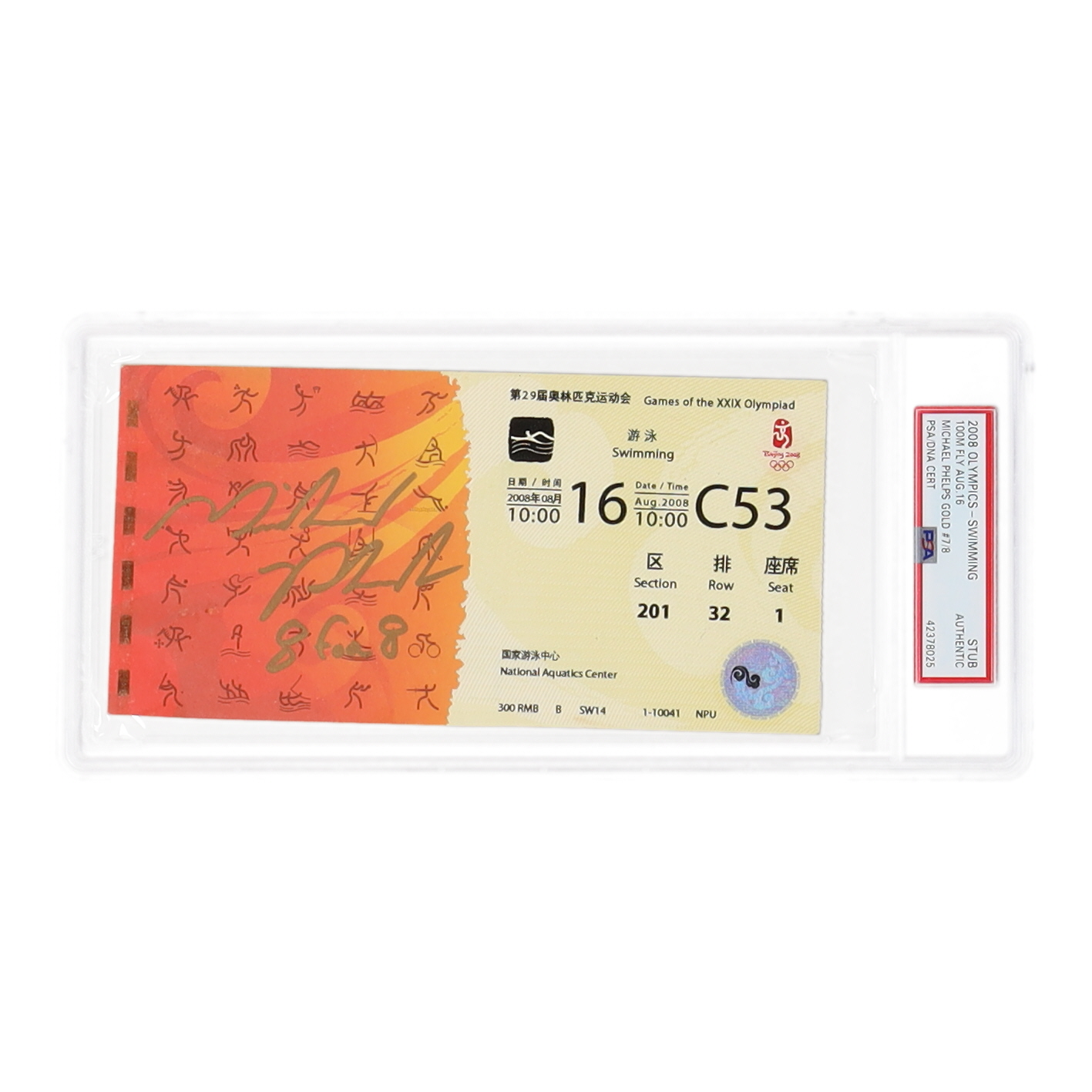 August 16, 2008 ticket has been hand-signed and inscribed by Michael Phelps.