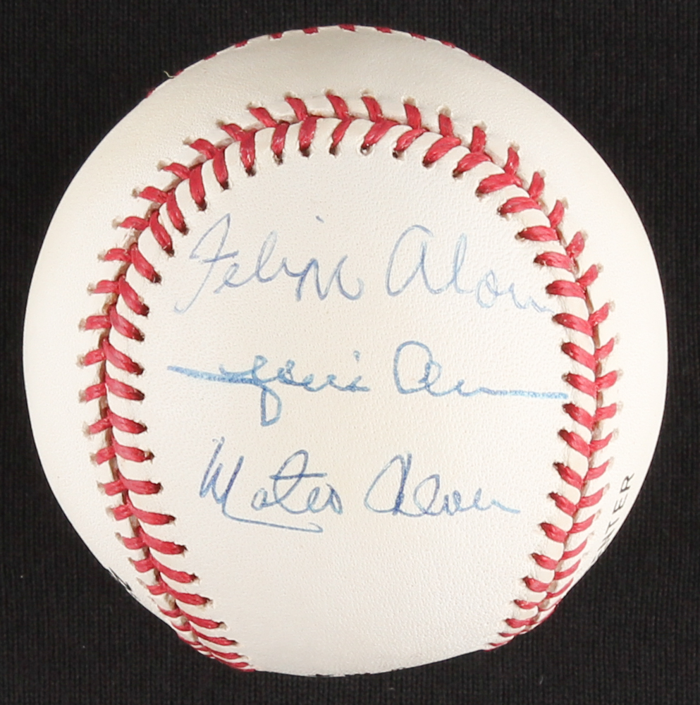 Official National League baseball. Hand-signed in blue ink pen by Matty, Jesus & Felipe Alou. Please note, the ball shows some spots of toning.