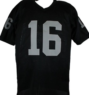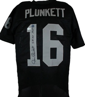 Jersey with everything sewn on, size XL. Hand-signed and inscribed by Jim Plunkett.