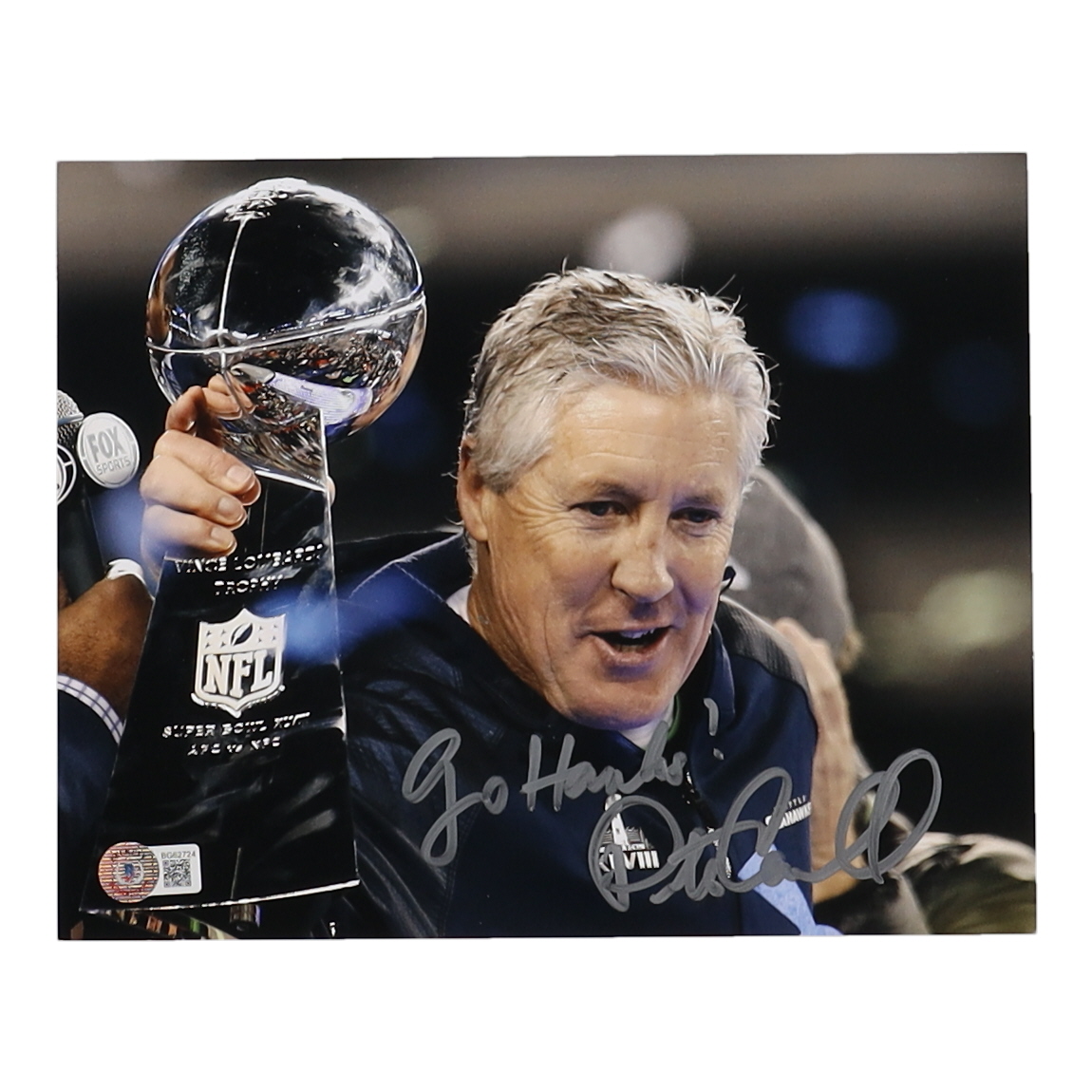 Photo measures 8" x 10" in size and has been hand-signed and inscribed by Pete Carroll (Seattle Seahawks).