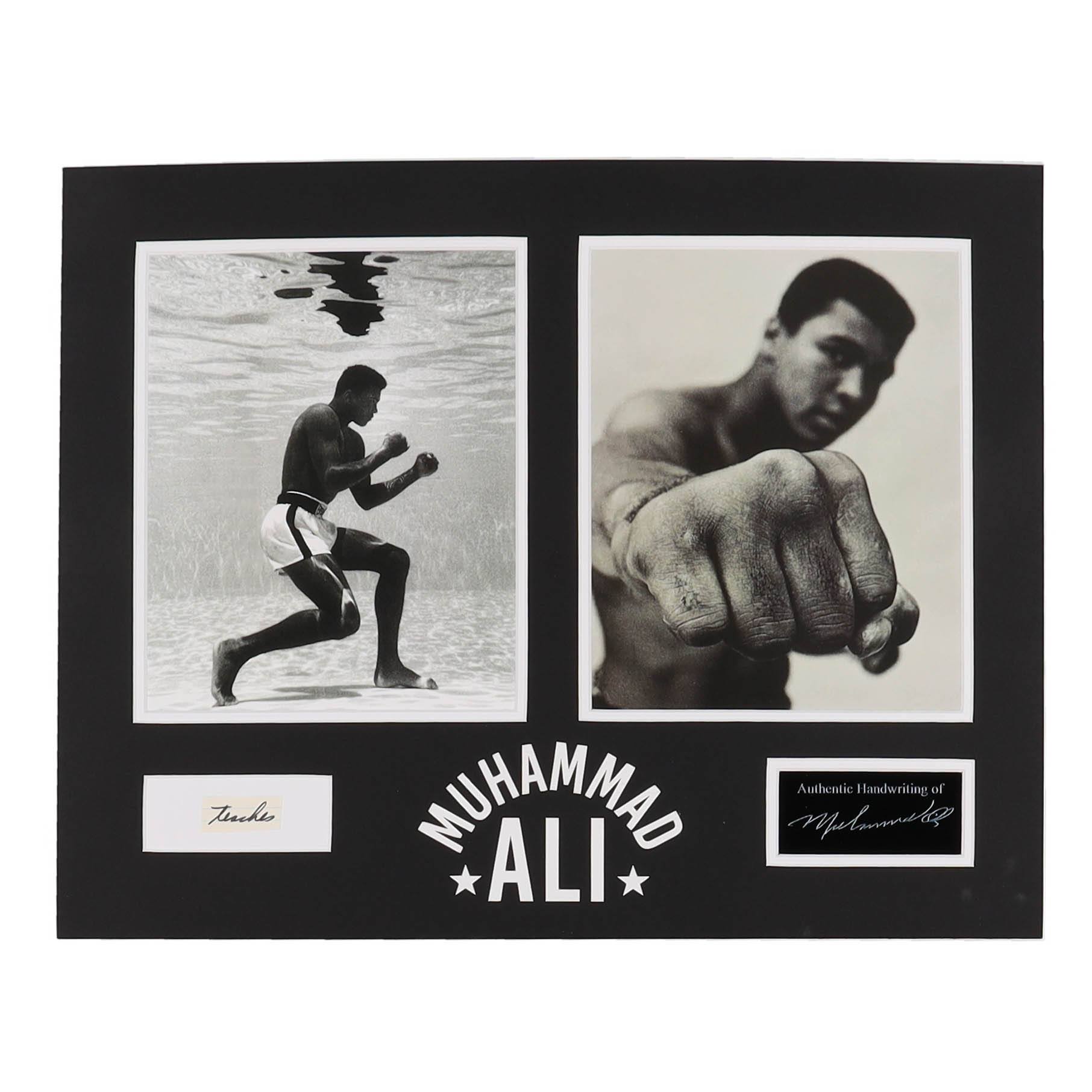 This custom matted display measures 16" x 20" in size. Features a cut with original handwriting from Muhammad Ali (D. 2016, HOF). The display also includes (2) photos of Ali and a plaque with a laser engraved full signature (not hand-signed).